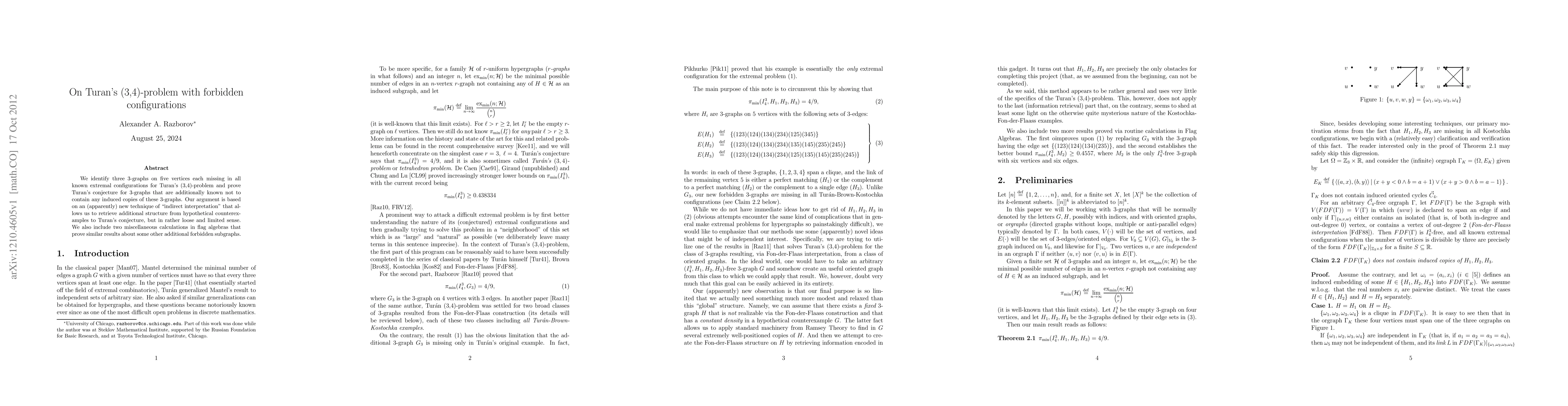 Researchers identified three forbidden 3-graphs in Turan's (3,4)-problem and proved Turan's conjecture for graphs without these subgraphs, using a novel 'indirect interpretation' technique.