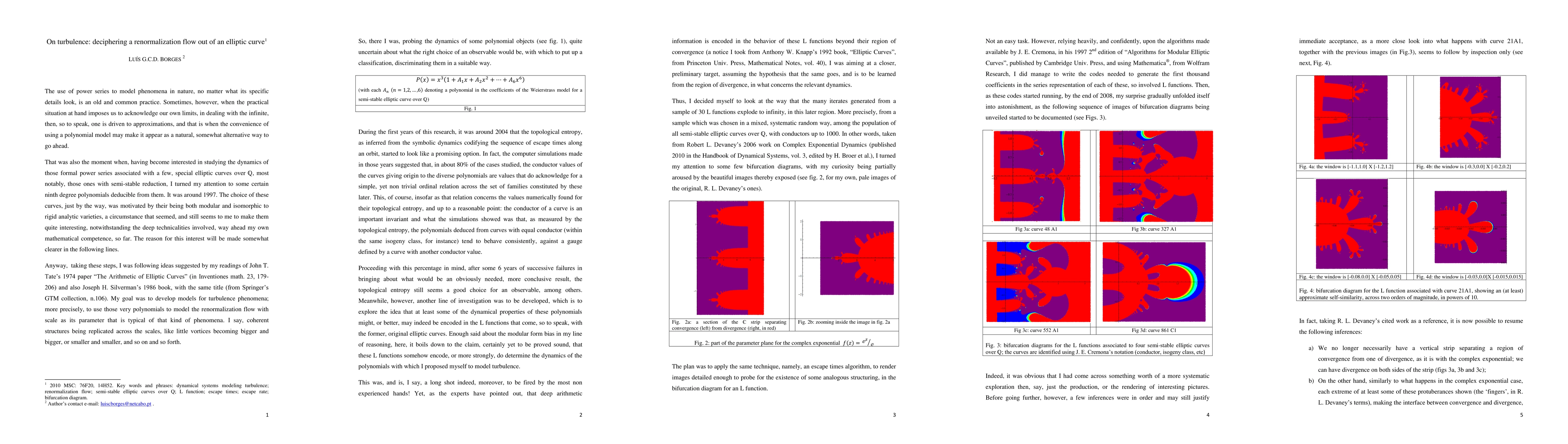 Some work in progress is announced, on the use of algebraic geometry, mostly concerning elliptic curve theory, to model turbulence. Attention is given to flows across the scales, on some convenient model space, and some current trials are exposed, where one seeks for an ordinal correlation between the escape rates of some L functions and a proper observable on these mentioned flows across the scales.