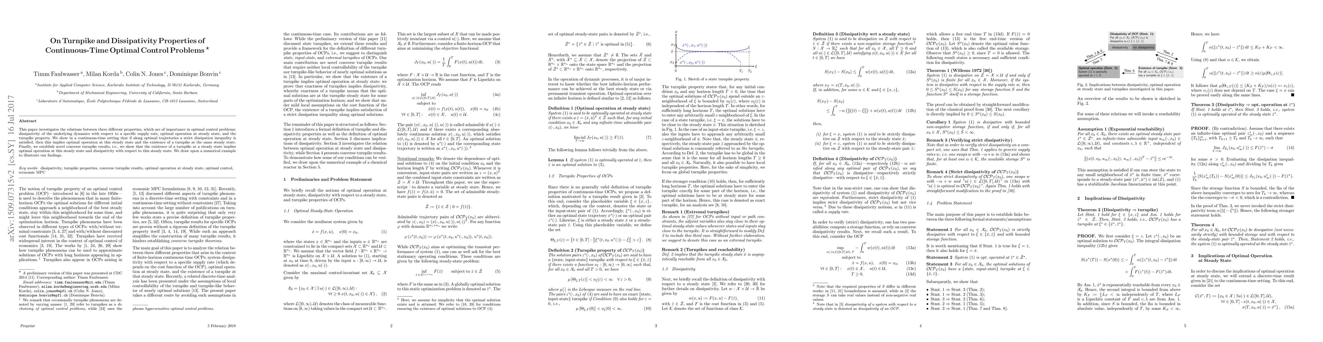 This paper explores the connections between dissipativity, optimal steady-state operation, and the turnpike property in continuous-time optimal control problems, demonstrating that strict dissipativity implies both optimal steady-state operation and the existence of a turnpike, and vice versa. A numerical example is used to illustrate these results.