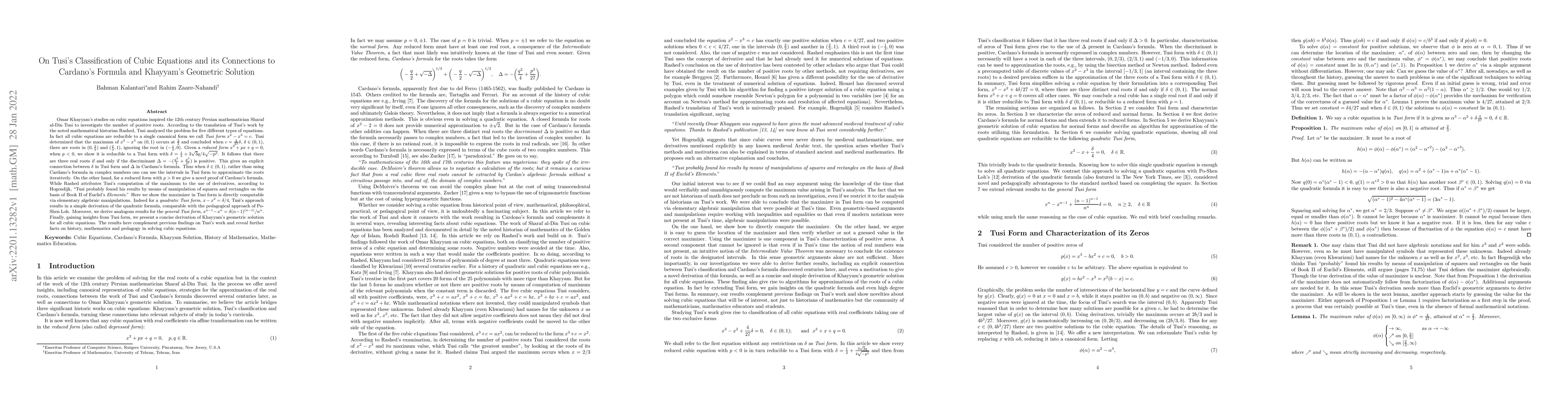 Omar Khayyam's studies on cubic equations inspired the 12th century Persian mathematician Sharaf al-Din Tusi to investigate the number of positive roots. According to the noted mathematical historian Rashed, Tusi analyzed the problem for five different types of equations. In fact all cubic equations are reducible to a form {\it Tusi form} $x^2-x^3=c$. Tusi determined that the maximum of $x^2-x^3$ on $(0,1)$ occurs at $\frac{2}{3}$ and concluded when $c=\frac{4}{27} \delta$, $\delta \in (0,1)$, there are roots in $(0, \frac{2}{3})$ and $(\frac{2}{3},1)$, ignoring the root in $(-\frac{1}{3},0)$. Given a {\it reduced form} $x^3+px+q=0$, when $p <0$, we show it is reducible to a Tusi form with $\delta = \frac{1}{2} + {3\sqrt{3} q}/{4\sqrt{-p^3}}$. It follows there are three real roots if and only if $\Delta =-(\frac{q^2}{4}+\frac{p^3}{27})$ is positive. This gives an explicit connection between $\delta$ in Tusi form and $\Delta$ in Cardano's formula. Thus when $\delta \in (0,1)$, rather than using Cardano's formula in complex numbers one can approximate the roots iteratively. On the other hand, for a reduced form with $p >0$ we give a novel proof of Cardono's formula. While Rashed attributes Tusi's computation of the maximum to the use of derivatives, according to Hogendijk, Tusi was probably influenced by Euclid. Here we show the maximizer in Tusi form is computable via elementary algebraic manipulations. Indeed for a {\it quadratic Tusi form}, $x-x^2=\delta/4$, Tusi's approach results in a simple derivation of the quadratic formula, comparable with the pedagogical approach of Po-Shen Loh. Moreover, we derive analogous results for the {\it general Tusi form}. Finally, we present a novel derivation of Khayyam's geometric solution. The results complement previous findings on Tusi's work and reveal further facts on history, mathematics and pedagogy in solving cubic equations.