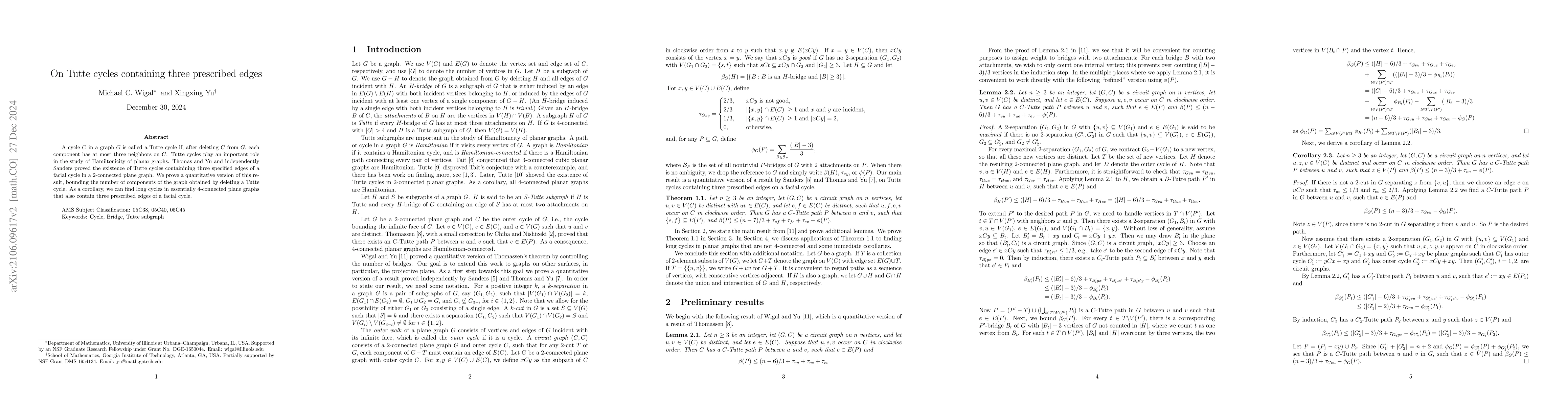 Researchers prove a quantitative version of the existence of Tutte cycles containing three specified edges in 2-connected plane graphs, bounding the number of components after deletion.
