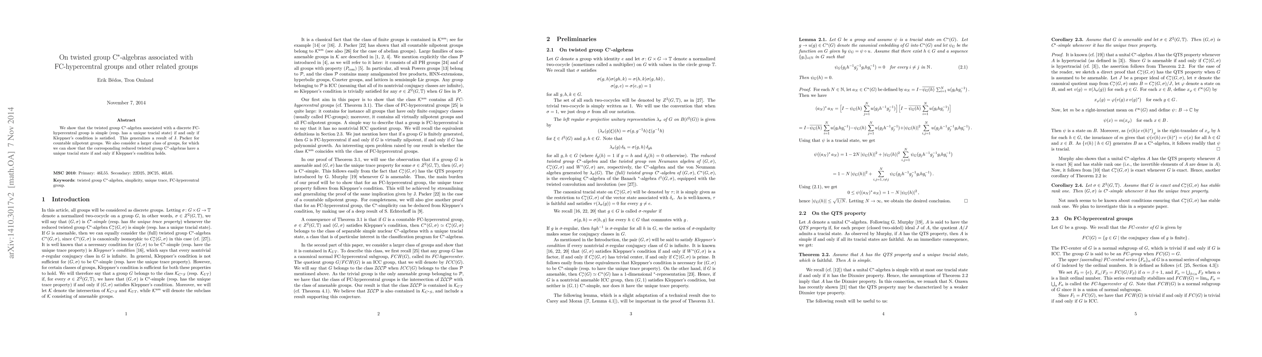 We show that the twisted group C$^*$-algebra associated with a discrete FC-hypercentral group is simple (resp. has a unique tracial state) if and only if Kleppner's condition is satisfied. This generalizes a result of J. Packer for countable nilpotent groups. We also consider a larger class of groups, for which we can show that the corresponding reduced twisted group C$^*$-algebras have a unique tracial state if and only if Kleppner's condition holds.