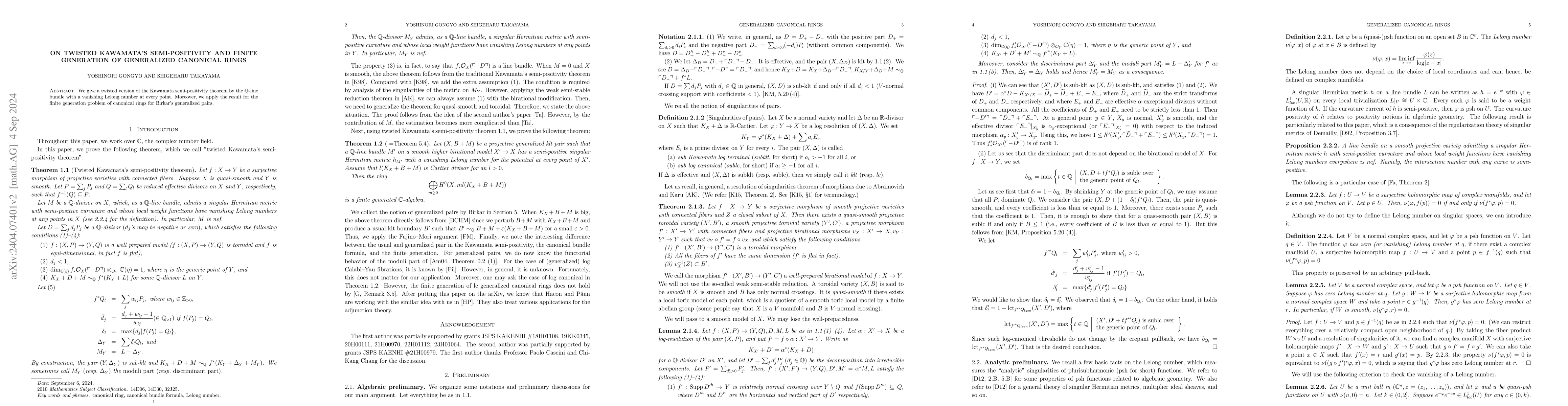 Two-line summary: This paper presents a twisted version of Kawamata's semi-positivity theorem involving $\mathbb{Q}$-line bundles and vanishing Lelong numbers. The result is then applied to demonstrate the finite generation of canonical rings for Birkar's generalized pairs.
