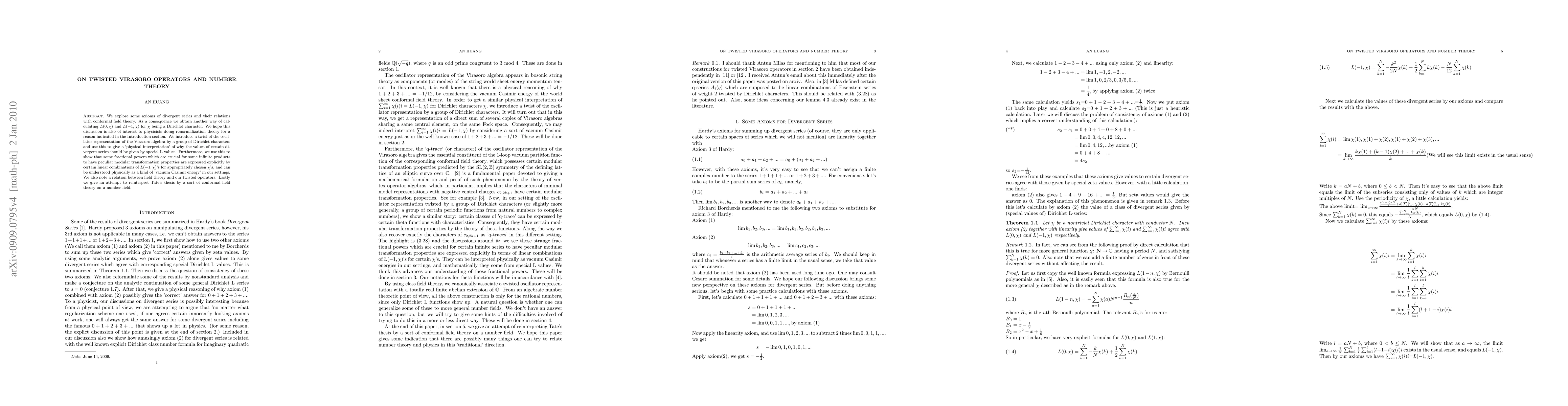 We explore some axioms of divergent series and their relations with conformal field theory. As a consequence we obtain another way of calculating $L(0,\chi)$ and $L(-1,\chi)$ for $\chi$ being a Dirichlet character. We hope this discussion is also of interest to physicists doing renormalization theory for a reason indicated in the Introduction section. We introduce a twist of the oscillator representation of the Virasoro algebra by a group of Dirichlet characters and use this to give a 'physical interpretation' of why the values of certain divergent series should be given by special L values. Furthermore, we use this to show that some fractional powers which are crucial for some infinite products to have peculiar modular transformation properties are expressed explicitly by certain linear combinations of $L(-1, \chi)$'s for appropriately chosen $\chi$'s, and can be understood physically as a kind of 'vacuum Casimir engergy' in our settings. We also note a relation between field theory and our twisted operators. Lastly we give an attempt to reinterpret Tate's thesis by a sort of conformal field theory on a number field.
