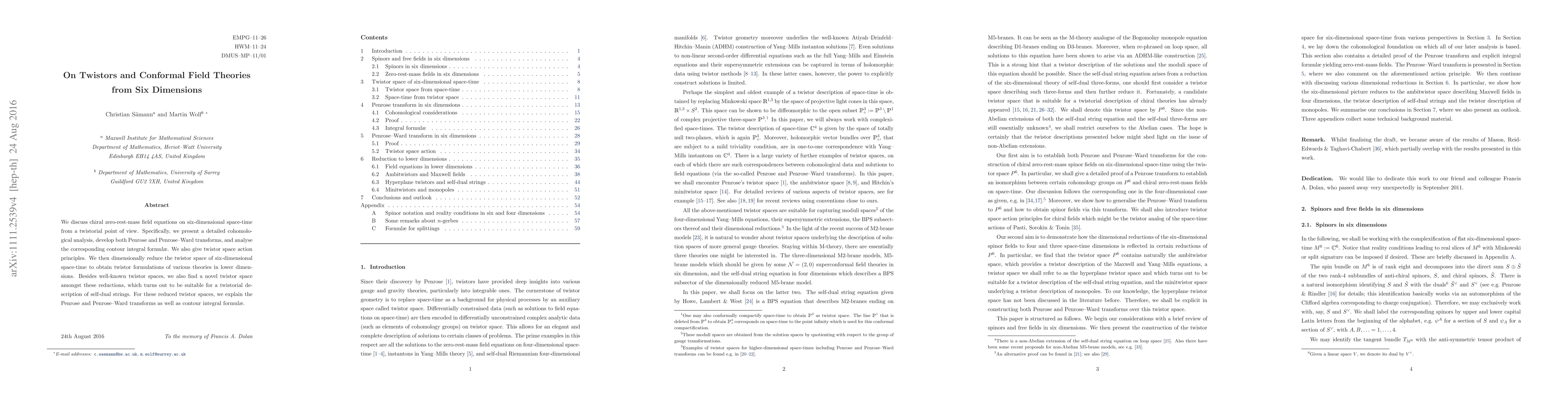 We discuss chiral zero-rest-mass field equations on six-dimensional space-time from a twistorial point of view. Specifically, we present a detailed cohomological analysis, develop both Penrose and Penrose-Ward transforms, and analyse the corresponding contour integral formulae. We also give twistor space action principles. We then dimensionally reduce the twistor space of six-dimensional space-time to obtain twistor formulations of various theories in lower dimensions. Besides well-known twistor spaces, we also find a novel twistor space amongst these reductions, which turns out to be suitable for a twistorial description of self-dual strings. For these reduced twistor spaces, we explain the Penrose and Penrose-Ward transforms as well as contour integral formulae.