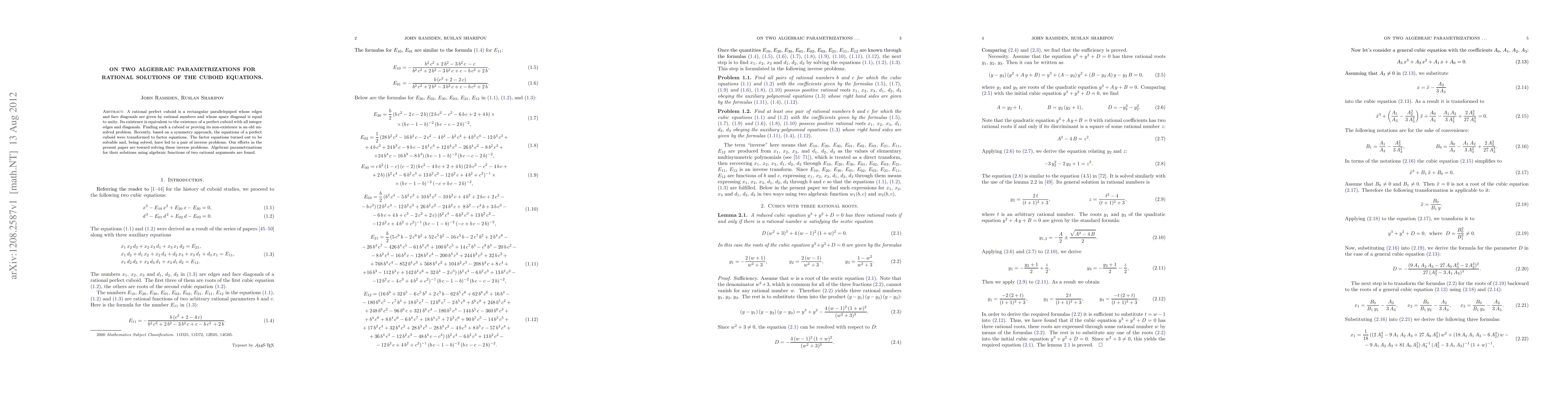 A rational perfect cuboid is a rectangular parallelepiped whose edges and face diagonals are given by rational numbers and whose space diagonal is equal to unity. Its existence is equivalent to the existence of a perfect cuboid with all integer edges and diagonals. Finding such a cuboid or proving its non-existence is an old unsolved problem. Recently, based on a symmetry approach, the equations of a perfect cuboid were transformed to factor equations. The factor equations turned out to be solvable and, being solved, have led to a pair of inverse problems. Our efforts in the present paper are toward solving these inverse problems. Algebraic parametrizations for their solutions using algebraic functions of two rational arguments are found.