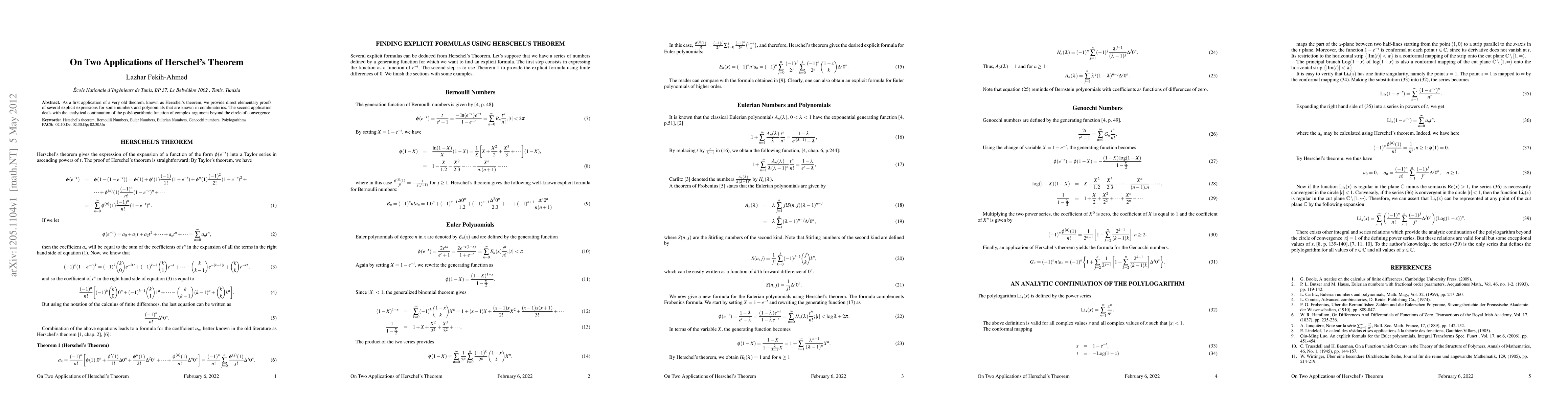 As a first application of a very old theorem, known as Herschel's theorem, we provide direct elementary proofs of several explicit expressions for some numbers and polynomials that are known in combinatorics. The second application deals with the analytical continuation of the polylogarithmic function of complex argument beyond the circle of convergence.