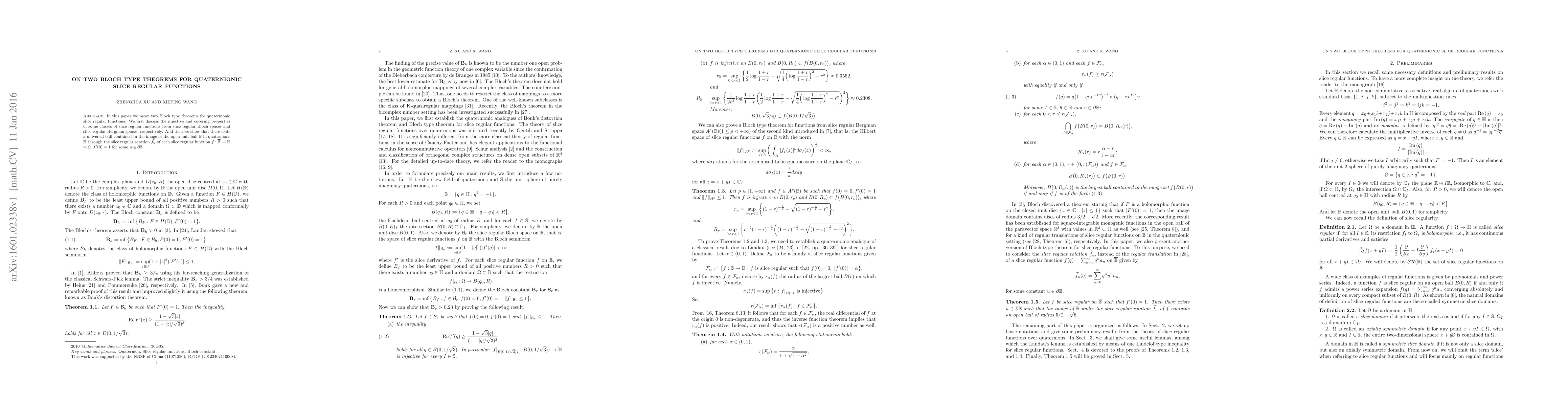 This paper proves two Bloch type theorems for quaternionic slice regular functions, establishing injective and covering properties in slice regular Bloch and Bergman spaces, and demonstrating that a universal ball is contained in the image of the open unit ball under the slice regular rotation of functions with a derivative of 1 at the origin.