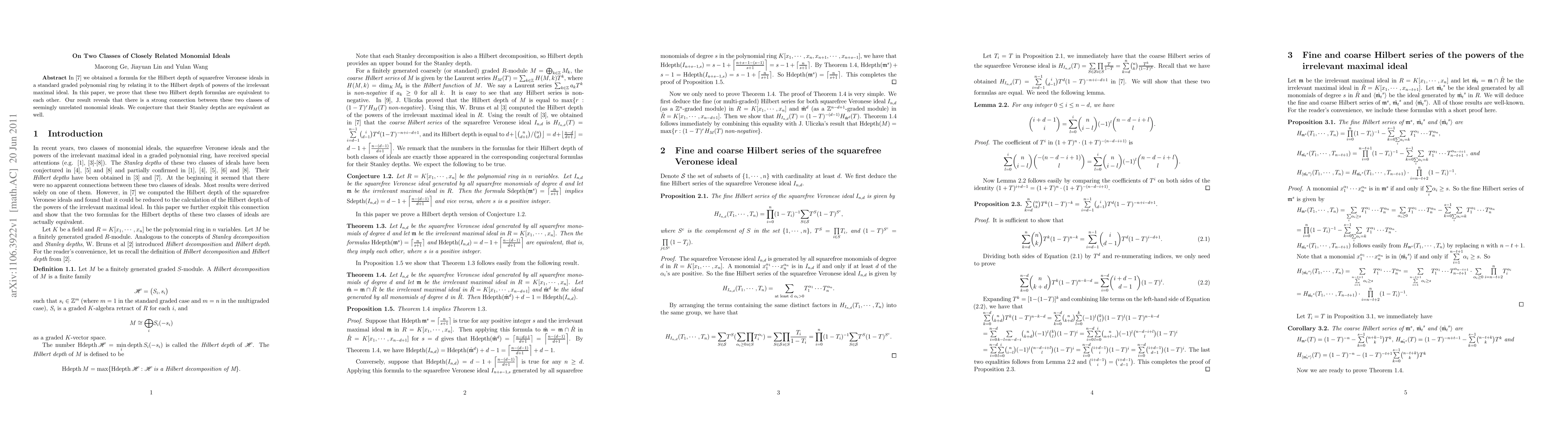 In [7] we obtained a formula for the Hilbert depth of squarefree Veronese ideals in a standard graded polynomial ring by relating it to the Hilbert depth of powers of the irrelevant maximal ideal. In this paper, we prove that these two Hilbert depth formulas are equivalent to each other. Our result reveals that there is a strong connection between these two classes of seemingly unrelated monomial ideals. We conjecture that their Stanley depths are equivalent as well.