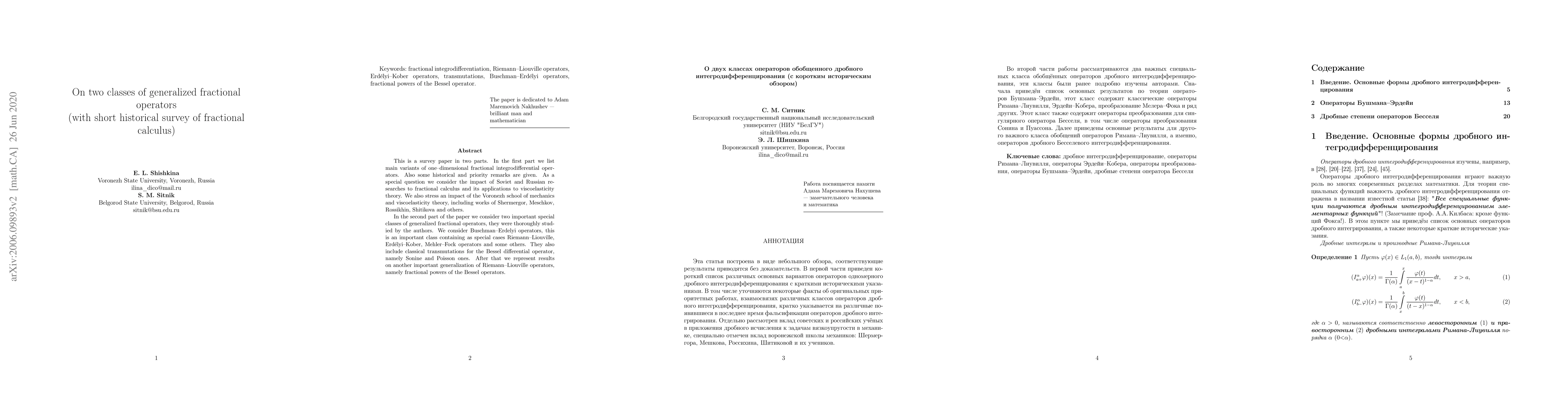 This is a survey paper in two parts. In the first part we list main variants of one-dimensional fractional integrodifferential operators. Also some historical and priority remarks are given. As a special question we consider the impact of Soviet and Russian researches to fractional calculus and its applications to viscoelasticity theory. We also stress an impact of the Voronezh school of mechanics and viscoelasticity theory, including works of Shermergor, Meschkov, Rossikhin, Shitikova and others. In the second part of the paper we consider two important special classes of generalized fractional operators, they were thoroughly studied by the authors. We consider Buschman-Erdelyi operators, this is an important class containing as special cases Riemann-Liouville, Erd\'elyi-Kober, Mehler-Fock operators and some others. They also include classical transmutations for the Bessel differential operator, namely Sonine and Poisson ones. After that we represent results on another important generalization of Riemann-Liouville operators, namely fractional powers of the Bessel operators. The paper is dedicated to Adam Maremovich Nakhushev -- brilliant man and mathematician.