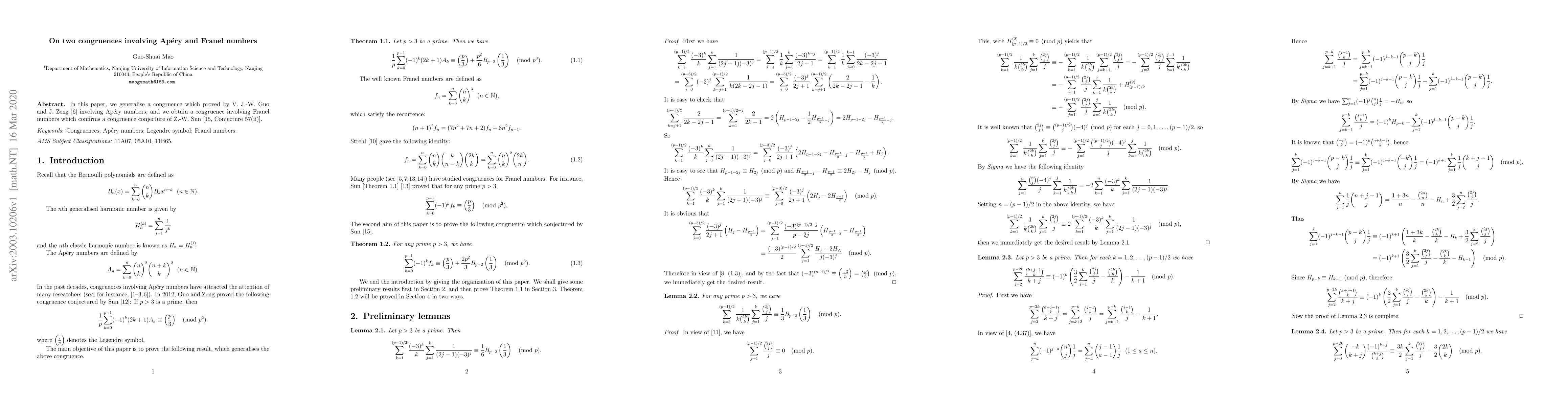 This paper generalises a congruence involving Apéry numbers and establishes a new congruence concerning Franel numbers, confirming a conjecture proposed by Z.-W. Sun.