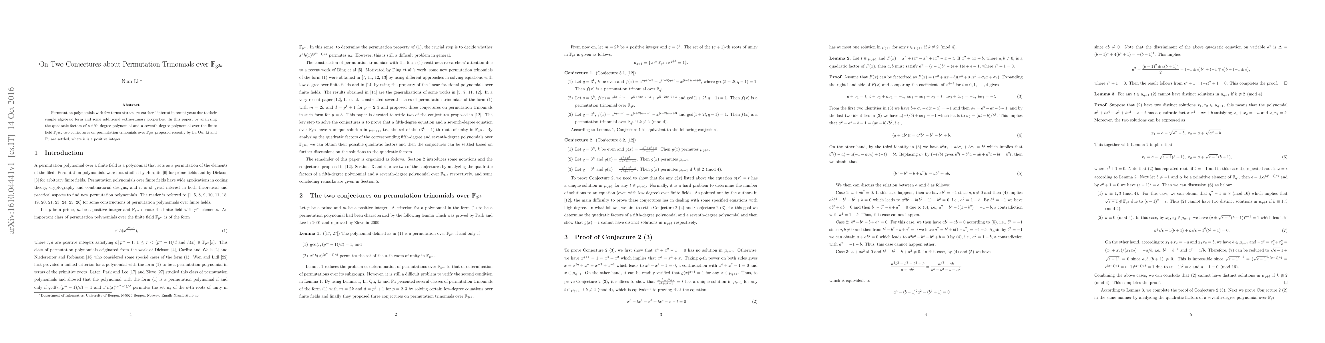 This paper resolves two conjectures regarding permutation trinomials over the finite field $\mathbb{F}_{3^{2k}}$ by examining the quadratic factors of a fifth-degree and a seventh-degree polynomial, providing insights into the algebraic structure and properties of these polynomials.