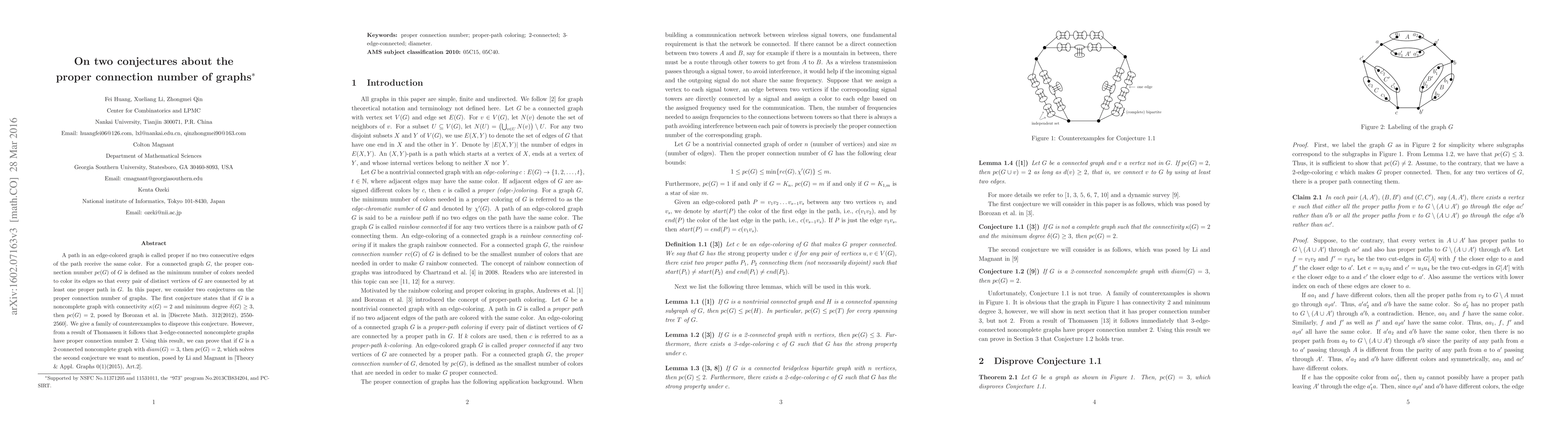 This paper disproves a conjecture about the proper connection number for graphs with connectivity 2 and minimum degree 3, providing counterexamples. It also proves another conjecture for 2-connected noncomplete graphs with diameter 3, confirming that their proper connection number is 2.