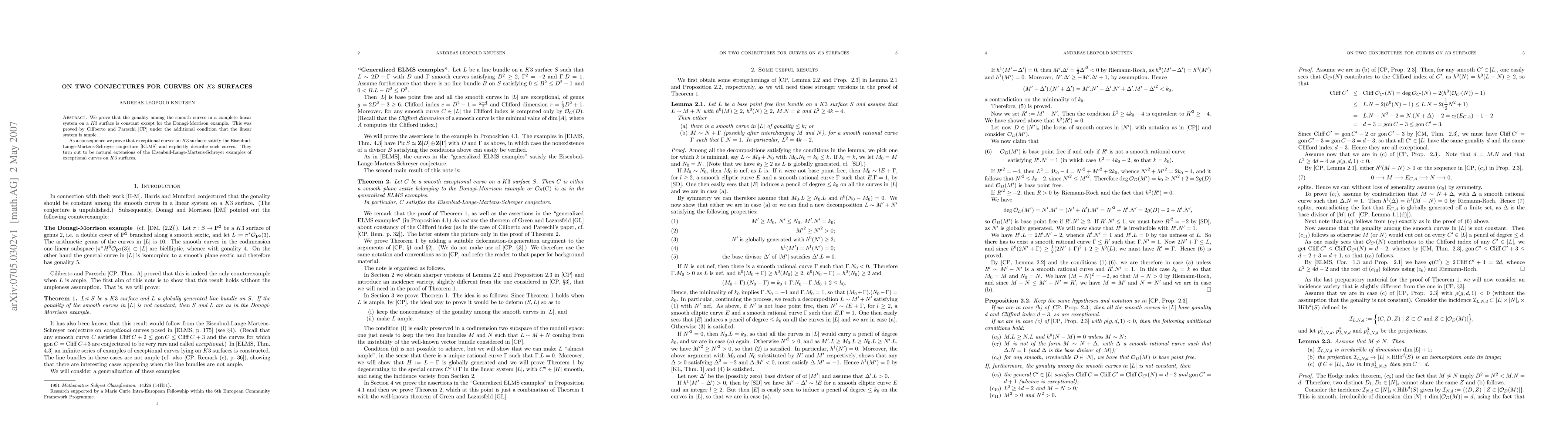 This paper demonstrates that the gonality of smooth curves in a complete linear system on a $K3$ surface is constant, except for the Donagi-Morrison case. It also proves the Eisenbud-Lange-Martens-Schreyer conjecture for exceptional curves on $K3$ surfaces, describing them as extensions of known examples.