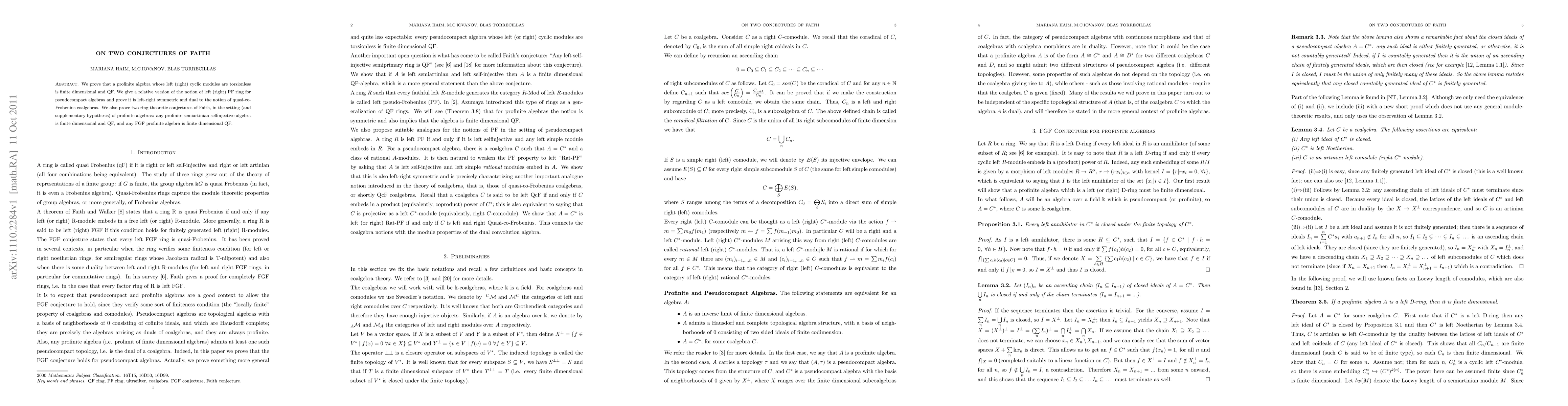 The paper proves that profinite algebras with torsionless left or right cyclic modules are finite dimensional and quasi-Frobenius, resolving two conjectures of Faith.