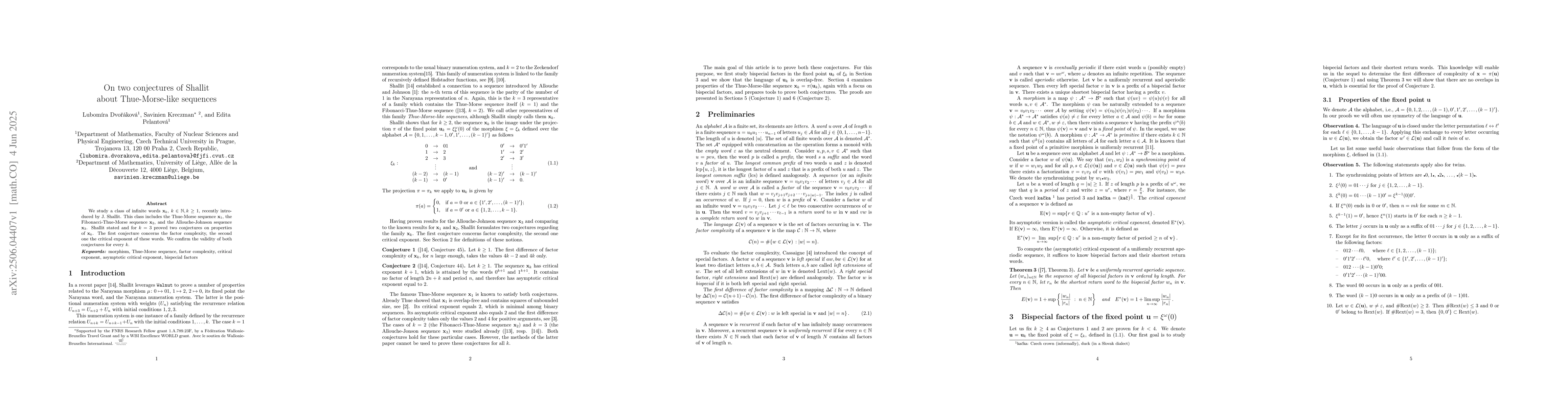 The paper provides a comprehensive proof for Shallit's conjectures on factor complexity and critical exponent for all positive integers $k$ in the class of Thue-Morse-like sequences $x_k$.
