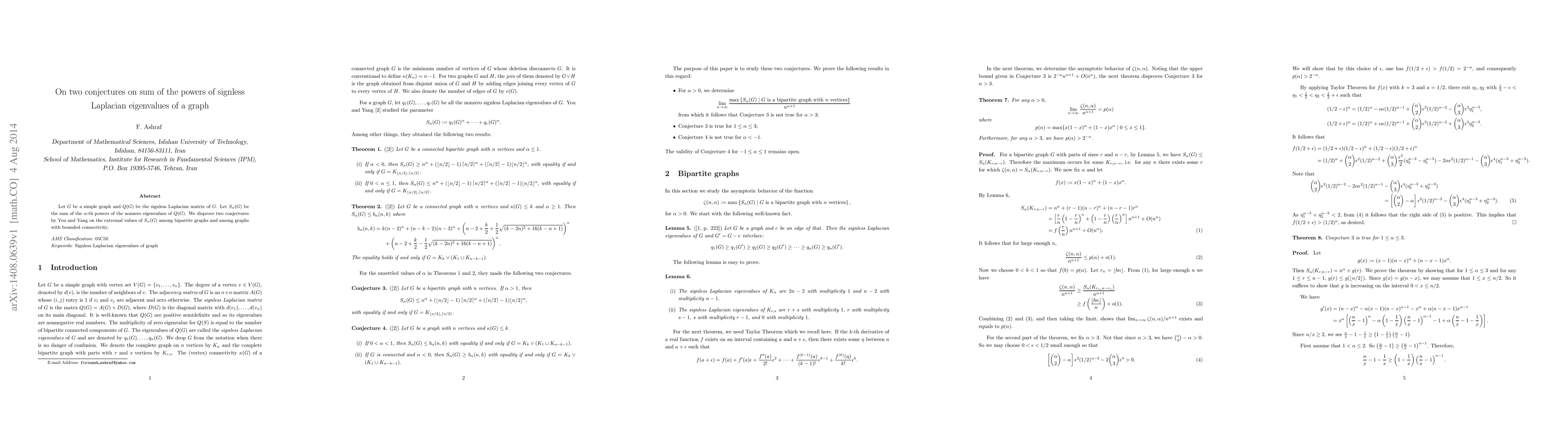 This paper disproves two conjectures regarding the extremal values of $S_\alpha(G)$, the sum of the $\alpha$-th powers of the nonzero eigenvalues of the signless Laplacian matrix $Q(G)$, for bipartite graphs and graphs with bounded connectivity. The findings challenge previous assumptions about these extremal values.