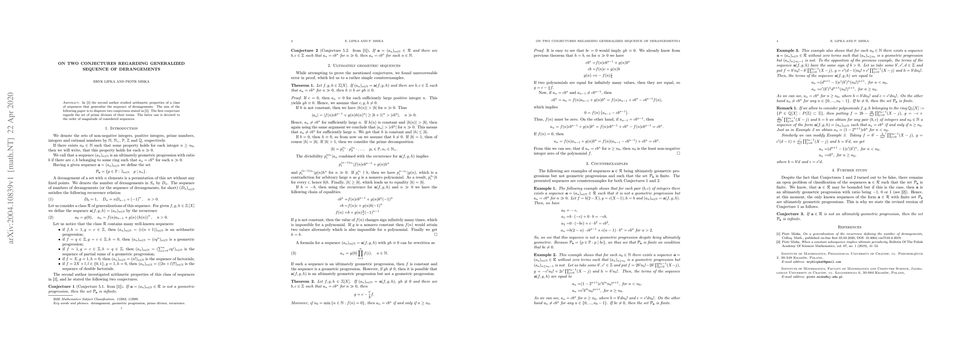 The second author studied arithmetic properties of a class of sequences that generalize the sequence of derangements. The aim of the following paper is to disprove two conjectures stated in \cite{miska}. The first conjecture regards the set of prime divisors of their terms. The latter one is devoted to the order of magnitude of considered sequences.