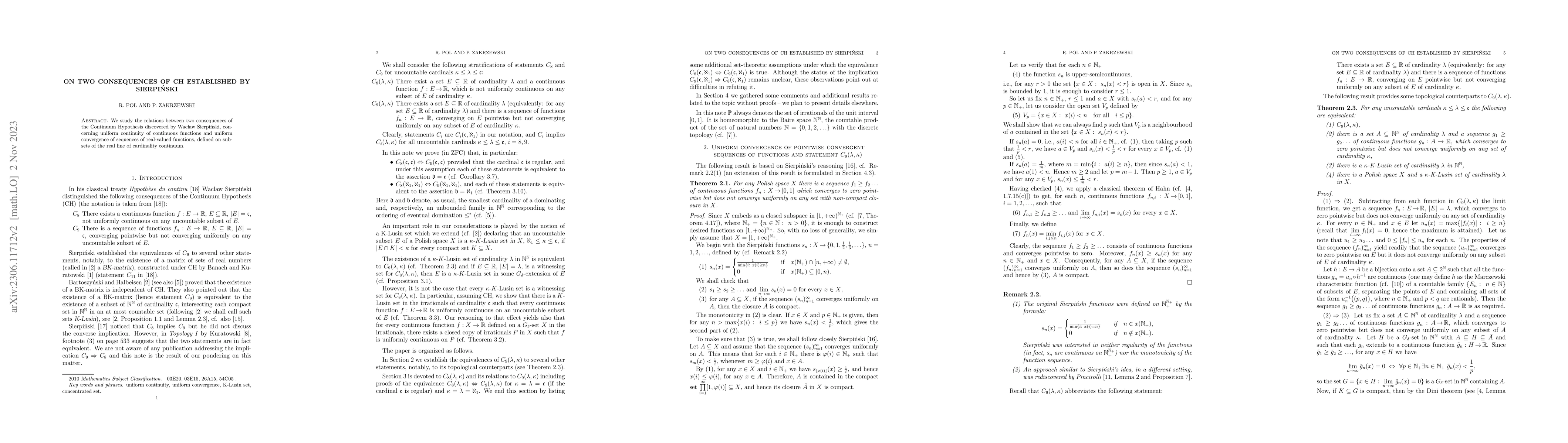Summary: This paper investigates the two consequences of the Continuum Hypothesis identified by Sierpińsky, focusing on the uniform continuity of continuous functions and uniform convergence of sequences of real-valued functions on subsets of the real line with cardinality continuum.