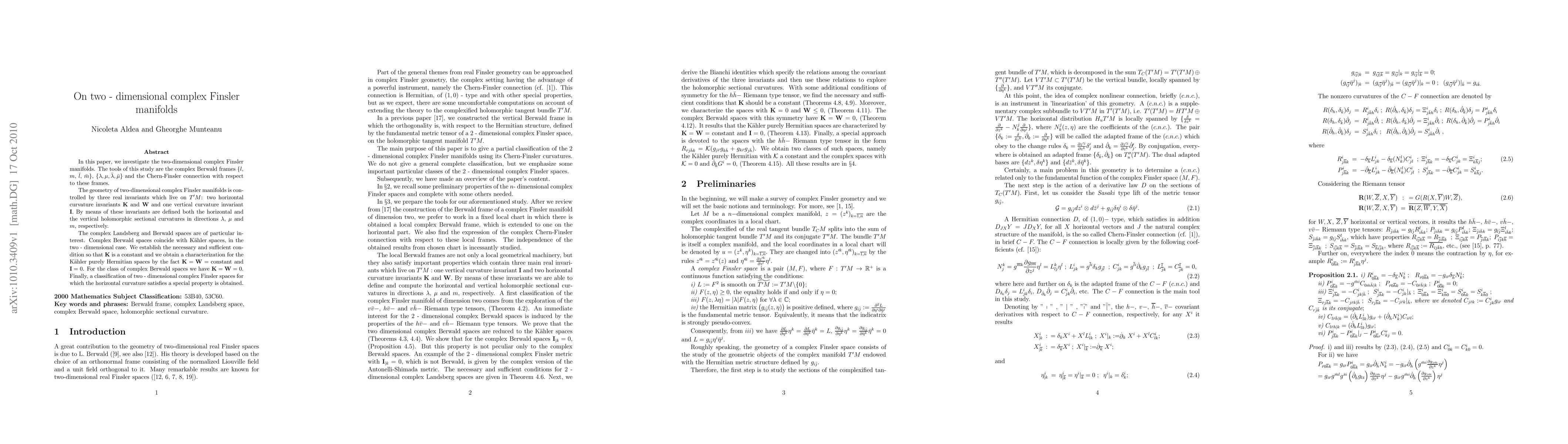 Summary: This paper explores two-dimensional complex Finsler manifolds using complex Berwald frames and the Chern-Finsler connection, providing insights into the geometric properties of these manifolds.