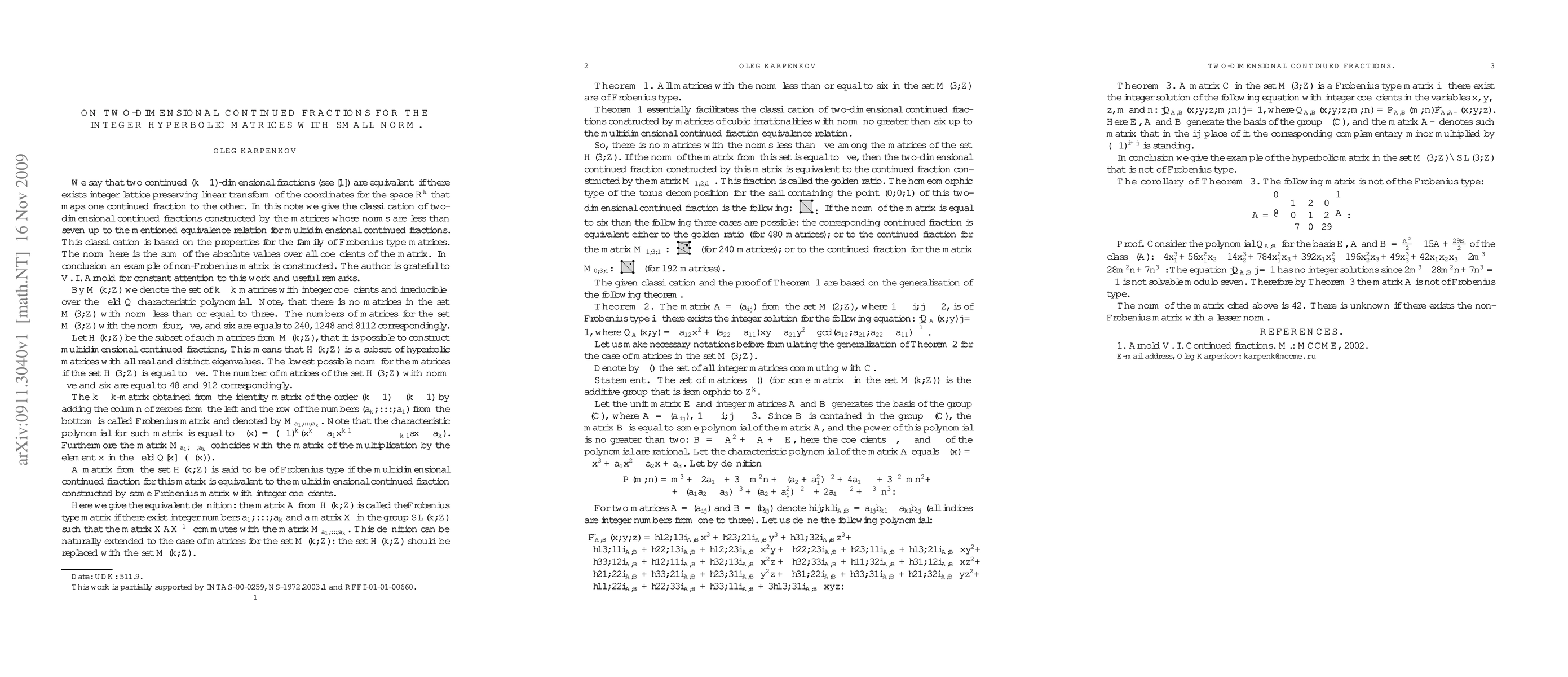 In this note we classify two-dimensional continued fractions for cubic irrationalities constructed by matrices with not large norm ($|*| \le 6$). The classification is based on the following new result: the class of matrices with an irreducible characteristic polynomial over the field of rational numbers is the class of matrices of frobenius type iff there exists an integer solution for a certain equation with integer coefficients.