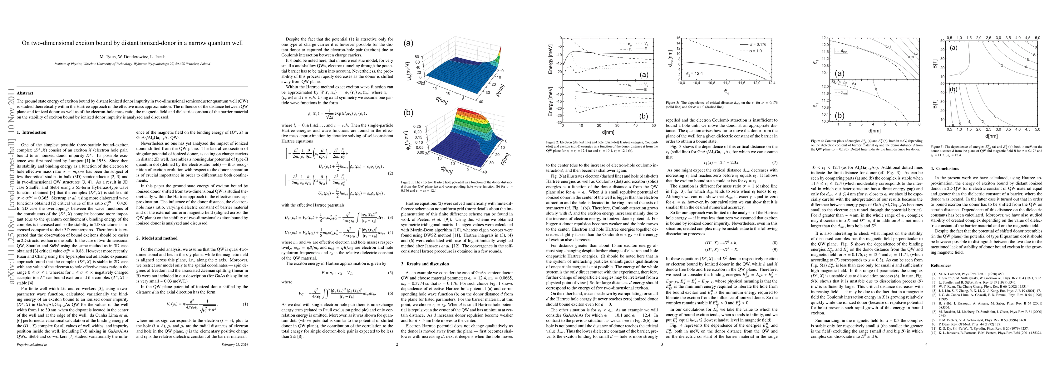 This paper theoretically investigates the ground state energy of an exciton bound to a distant ionized donor in a two-dimensional semiconductor quantum well using the Hartree approach. It analyzes the effects of the distance between the quantum well plane and the ionized donor, the electron-hole mass ratio, magnetic field, and the dielectric constant of the barrier material on exciton stability.