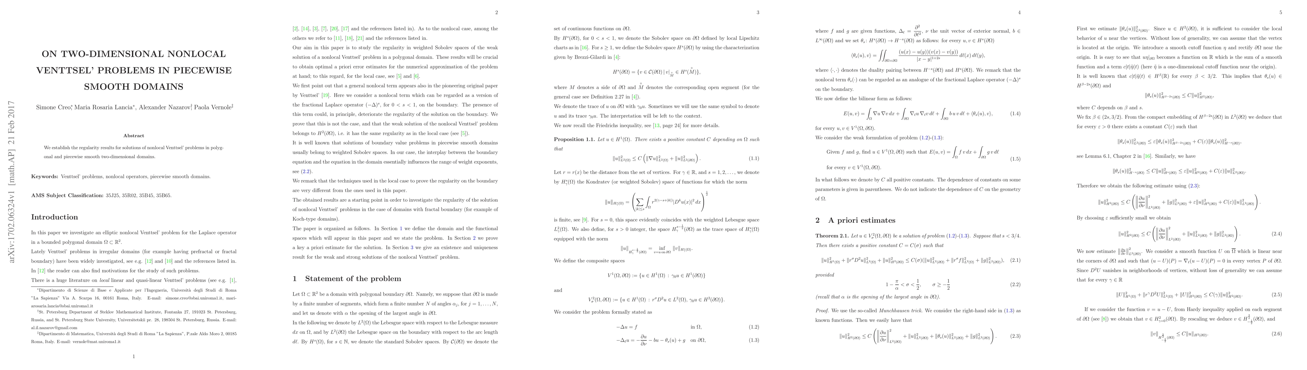 Summary: This paper establishes regularity results for solutions to nonlocal Venttsel' problems in two-dimensional polygonal and piecewise smooth domains, providing insights into the behavior of these solutions within such complex geometries.