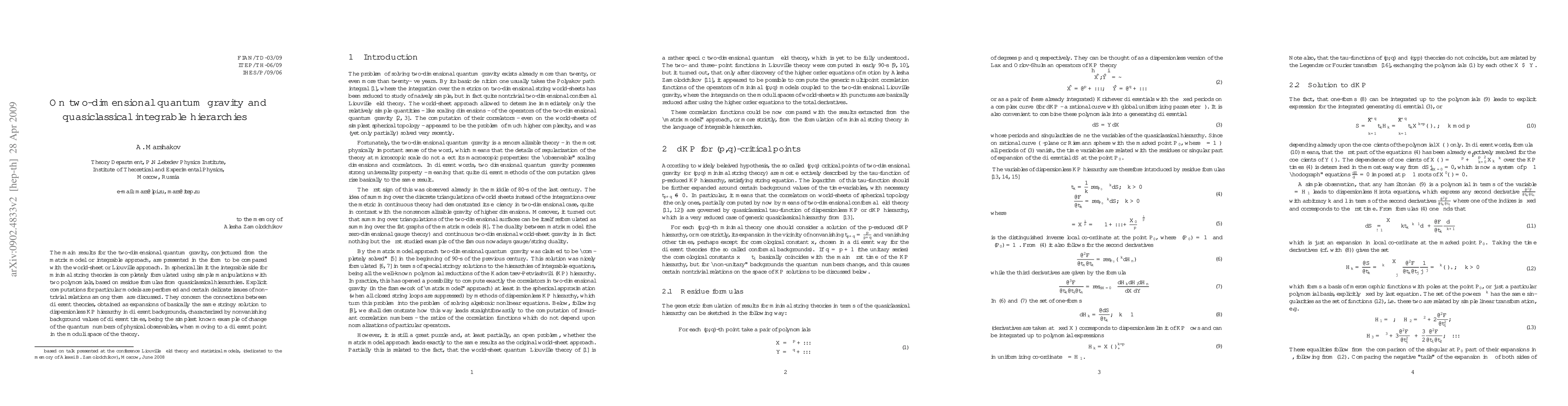 This paper presents conjectured results for two-dimensional quantum gravity from matrix models or integrable approaches, comparing them with world-sheet or Liouville approaches. It formulates the integrable side for minimal string theories using residue formulas from quasiclassical hierarchies, and discusses connections between different theories derived from the same stringy solution.