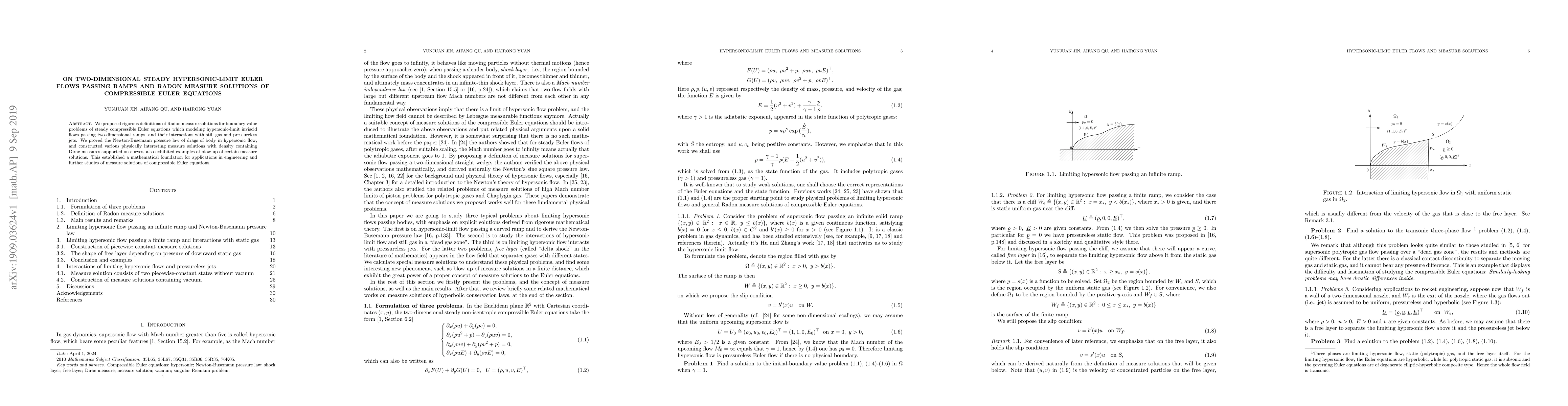 We proposed rigorous definitions of Radon measure solutions for boundary value problems of steady compressible Euler equations which modeling hypersonic-limit inviscid flows passing two-dimensional ramps, and their interactions with still gas and pressureless jets. We proved the Newton-Busemann pressure law of drags of body in hypersonic flow, and constructed various physically interesting measure solutions with density containing Dirac measures supported on curves, also exhibited examples of blow up of certain measure solutions. This established a mathematical foundation for applications in engineering and further studies of measure solutions of compressible Euler equations.