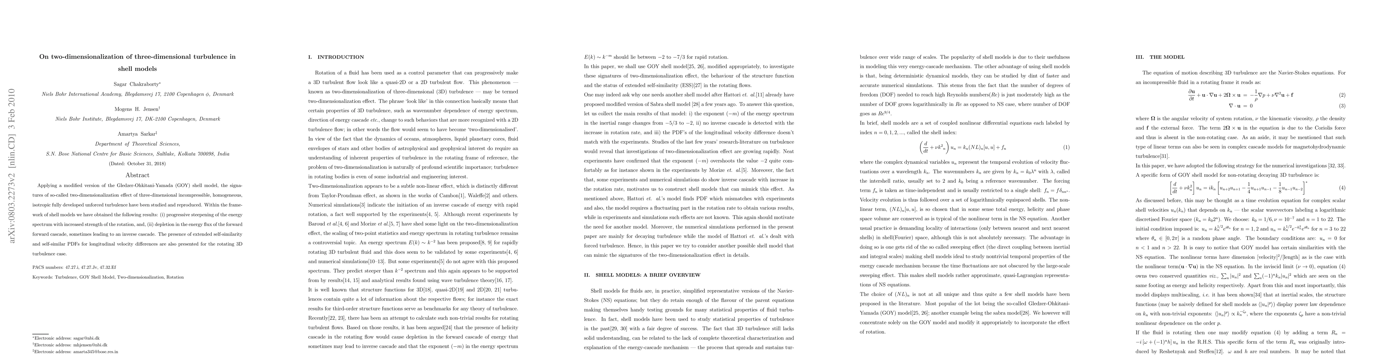 This paper investigates the two-dimensionalization effect in three-dimensional turbulence using a modified GOY shell model, finding progressive steepening of the energy spectrum and a depletion in the forward energy flux, sometimes causing an inverse cascade, alongside extended self-similarity and self-similar PDFs for longitudinal velocity differences.
