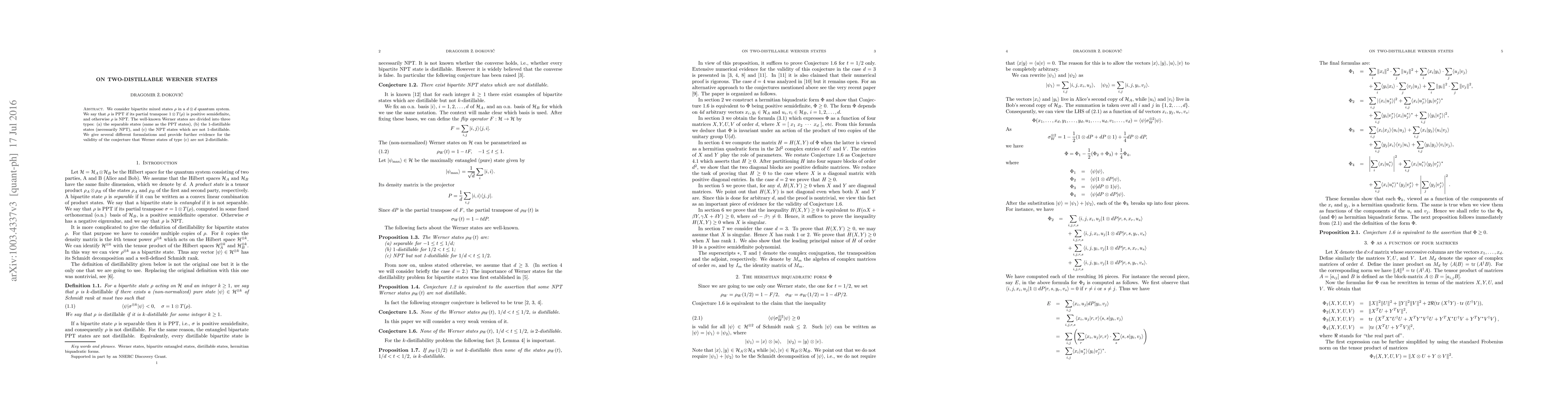We consider bipartite mixed states in a $d\otimes d$ quantum system. We say that $\rho$ is PPT if its partial transpose $1 \otimes T (\rho)$ is positive semidefinite, and otherwise $\rho$ is NPT. The well-known Werner states are divided into three types: (a) the separable states (the same as the PPT states); (b) the one-distillable states (necessarily NPT); and (c) the NPT states which are not one-distillable. We give several different formulations and provide further evidence for validity of the conjecture that the Werner states of type (c) are not two-distillable.