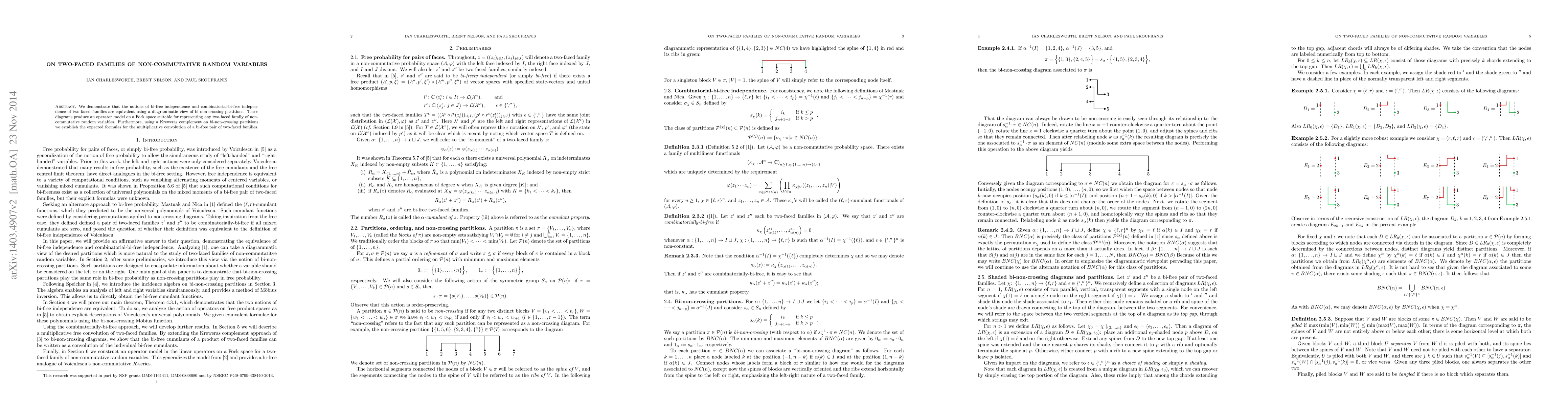 We demonstrate that the notions of bi-free independence and combinatorial-bi-free independence of two-faced families are equivalent using a diagrammatic view of bi-non-crossing partitions. These diagrams produce an operator model on a Fock space suitable for representing any two-faced family of non-commutative random variables. Furthermore, using a Kreweras complement on bi-non-crossing partitions we establish the expected formulas for the multiplicative convolution of a bi-free pair of two-faced families.