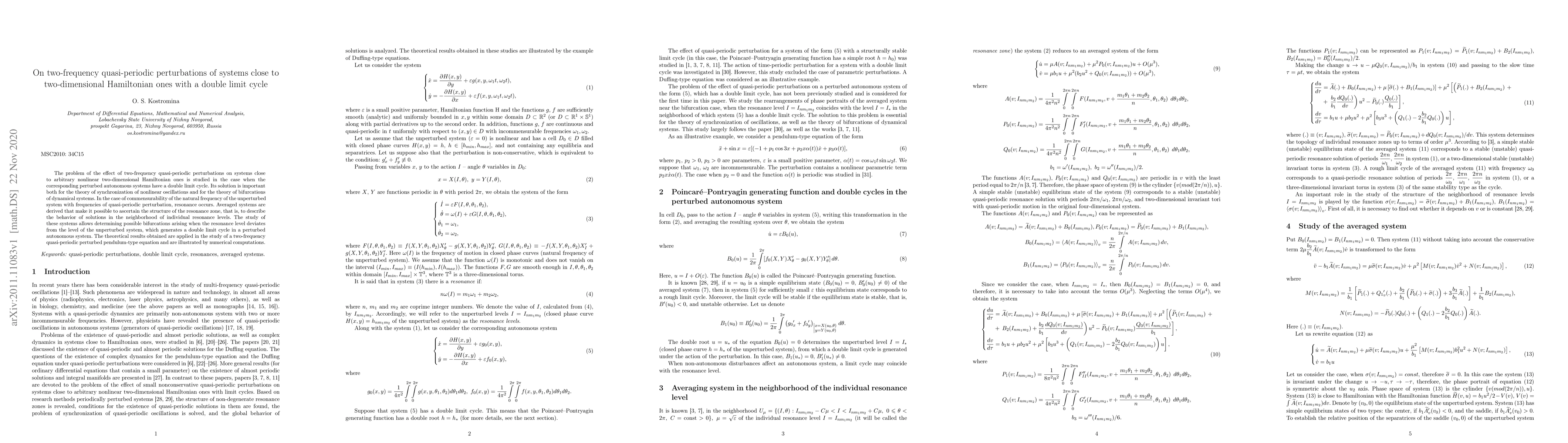 This paper investigates the influence of two-frequency quasi-periodic perturbations on systems near two-dimensional Hamiltonian systems with a double limit cycle, deriving averaged systems to analyze resonance zones and potential bifurcations. Numerical examples and computations illustrate the theoretical findings.