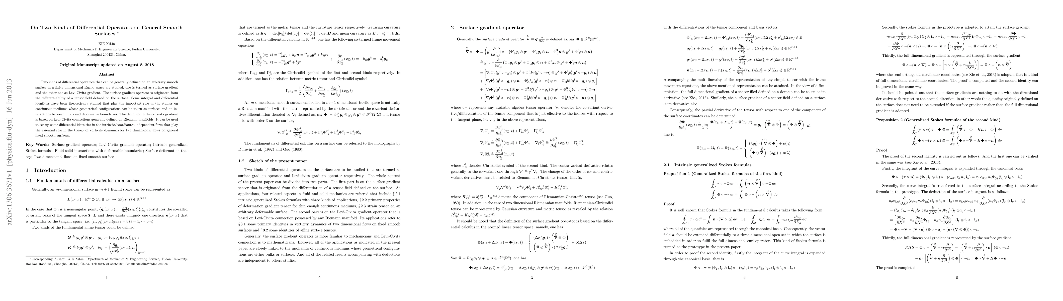 Two kinds of differential operators that can be generally defined on an arbitrary smooth surface in a finite dimensional Euclid space are studied, one is termed as surface gradient and the other one as Levi-Civita gradient. The surface gradient operator is originated from the differentiability of a tensor field defined on the surface. Some integral and differential identities have been theoretically studied that play the important role in the studies on continuous mediums whose geometrical configurations can be taken as surfaces and on interactions between fluids and deformable boundaries. The definition of Levi-Civita gradient is based on Levi-Civita connections generally defined on Riemann manifolds. It can be used to set up some differential identities in the intrinsic/coordiantes-independent form that play the essential role in the theory of vorticity dynamics for two dimensional flows on general fixed smooth surfaces.