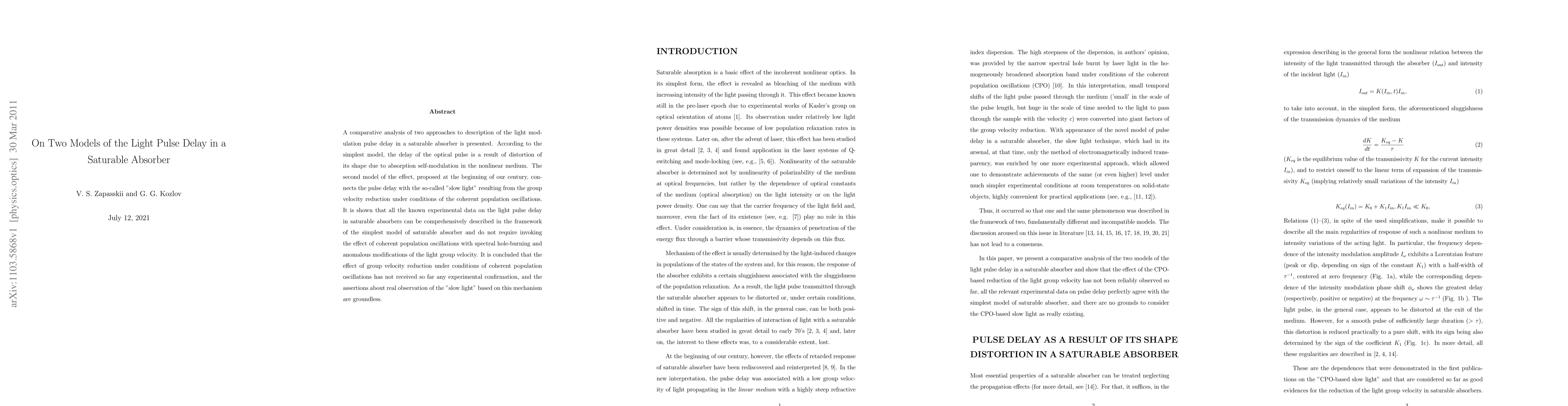 This paper compares two models explaining light pulse delay in saturable absorbers: one attributing delay to shape distortion due to absorption self-modulation, and another linking it to "slow light" from group velocity reduction. The study concludes that the simplest model suffices to explain experimental data without needing coherent population oscillations.