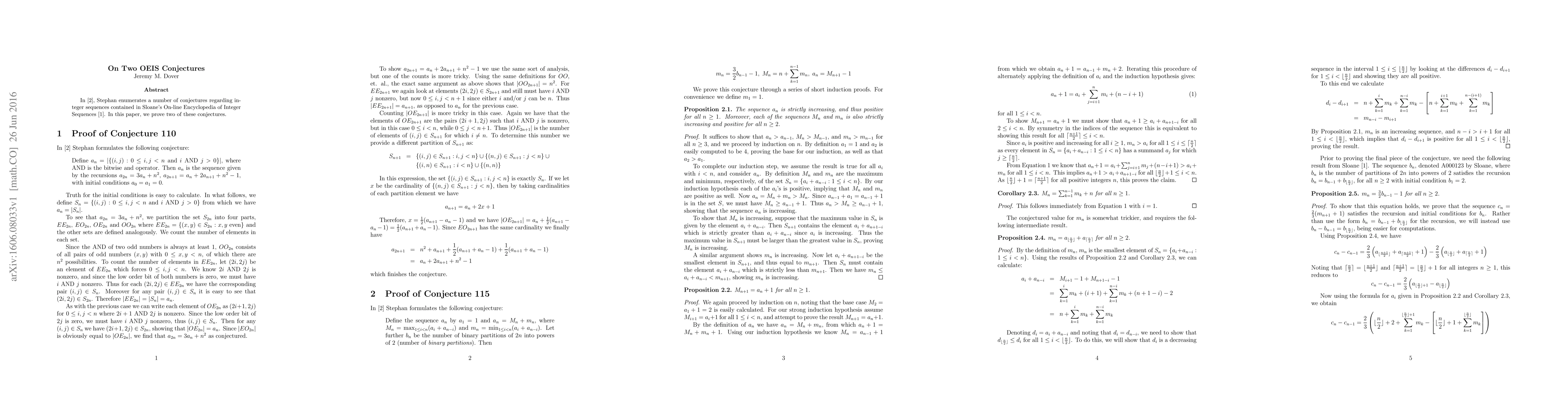 This paper proves two conjectures proposed by Stephan in the OEIS, specifically addressing integer sequences from Sloane's On-line Encyclopedia of Integer Sequences. The work contributes to the validation of mathematical patterns within these sequences.