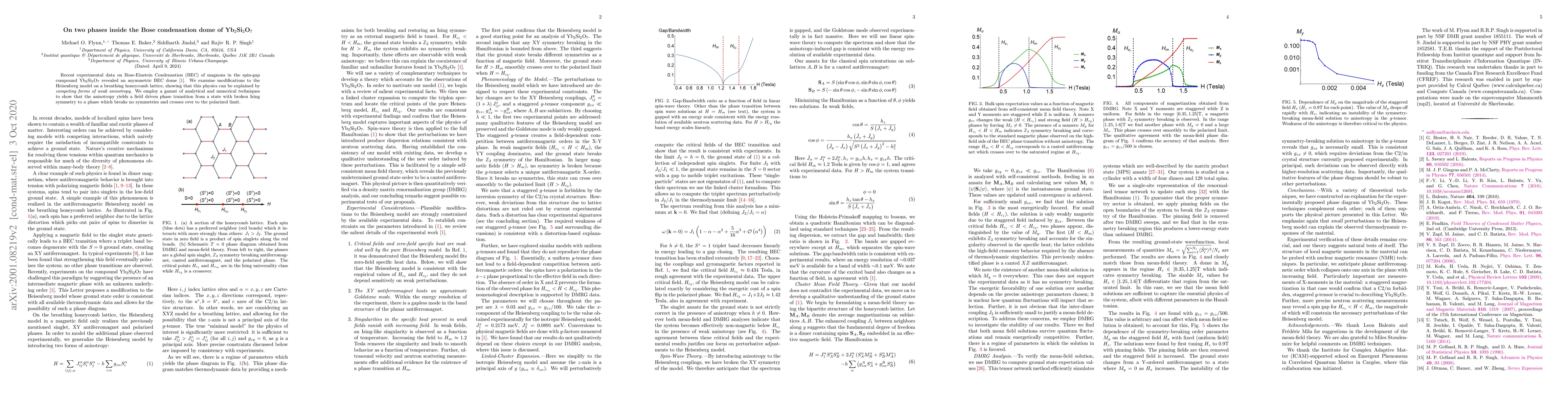 Recent experimental data on Bose-Einstein Condensation (BEC) of magnons in the spin-gap compound Yb$_2$Si$_2$O$_7$ revealed an asymmetric BEC dome arXiv:1810.13096v2. We examine modifications to the Heisenberg model on a breathing honeycomb lattice, showing that this physics can be explained by competing forms of weak anisotropy. We employ a gamut of analytical and numerical techniques to show that the anisotropy yields a field driven phase transition from a state with broken Ising symmetry to a phase which breaks no symmetries and crosses over to the polarized limit.