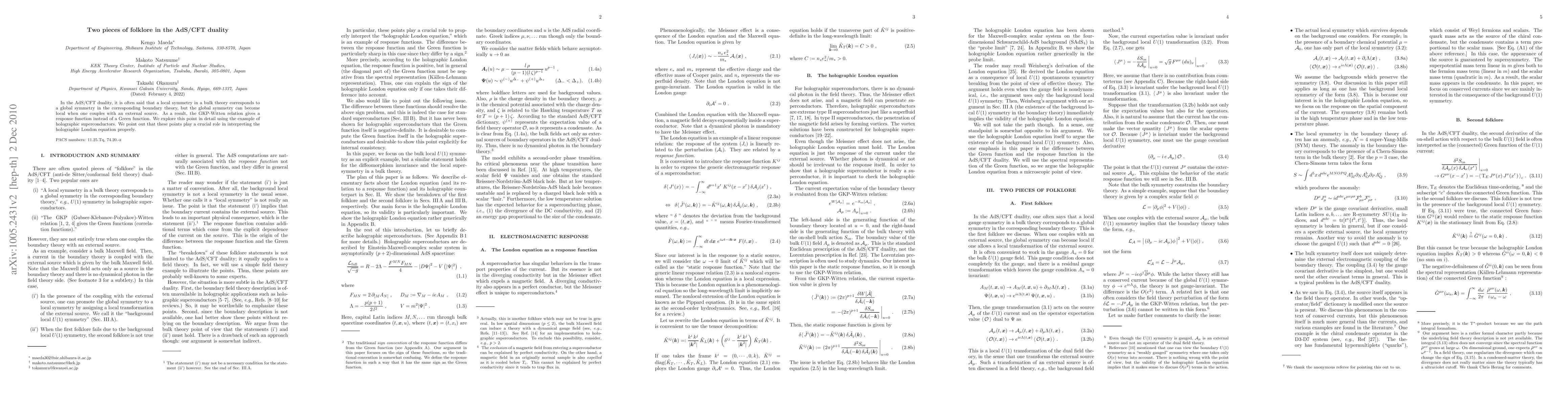 In the AdS/CFT duality, it is often said that a local symmetry in a bulk theory corresponds to a global symmetry in the corresponding boundary theory, but the global symmetry can become local when one couples with an external source. As a result, the GKP-Witten relation gives a response function instead of a Green function. We explore this point in details using the example of holographic superconductors. We point out that these points play a crucial role to interpret the holographic London equation properly.