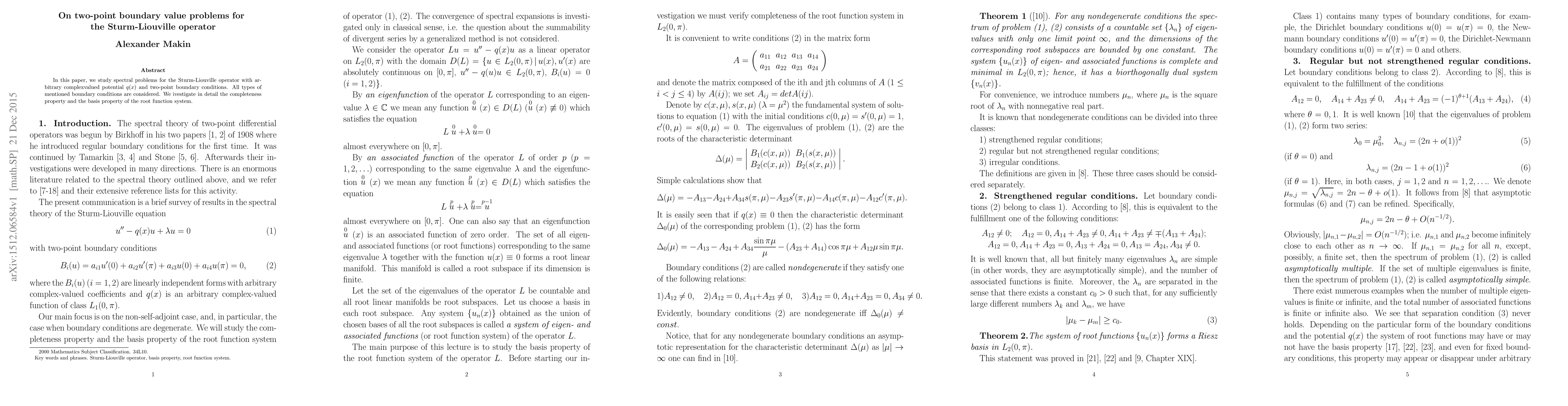 This paper examines spectral problems for the Sturm-Liouville operator with complex potentials and various two-point boundary conditions, focusing on the completeness and basis properties of the resulting root function system.