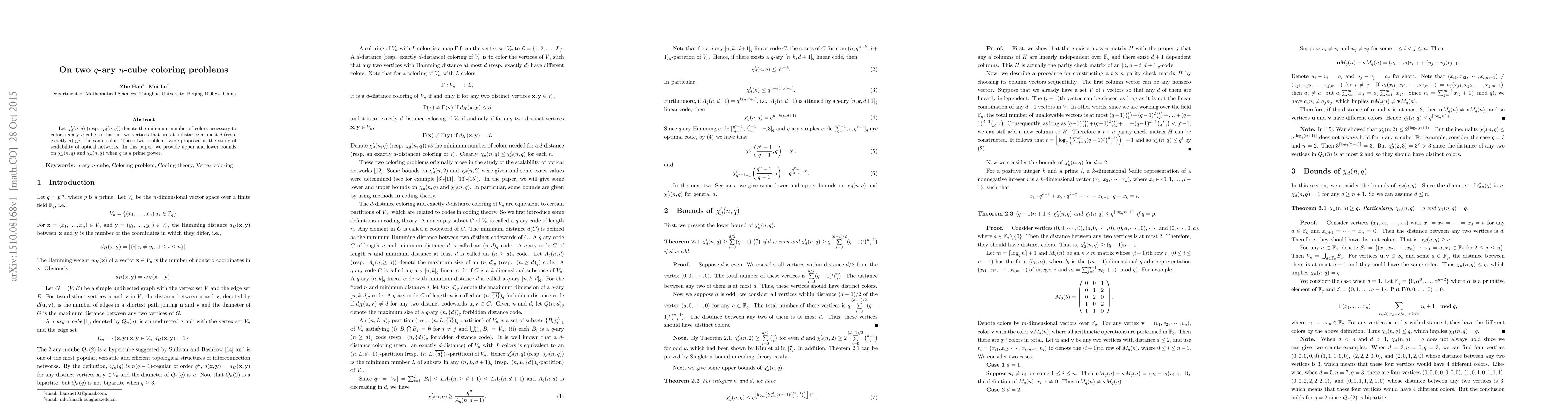 This research paper provides upper and lower bounds on the minimum number of colors needed to color a q-ary n-cube without two vertices at distance d or exactly d having the same color for prime power q.
