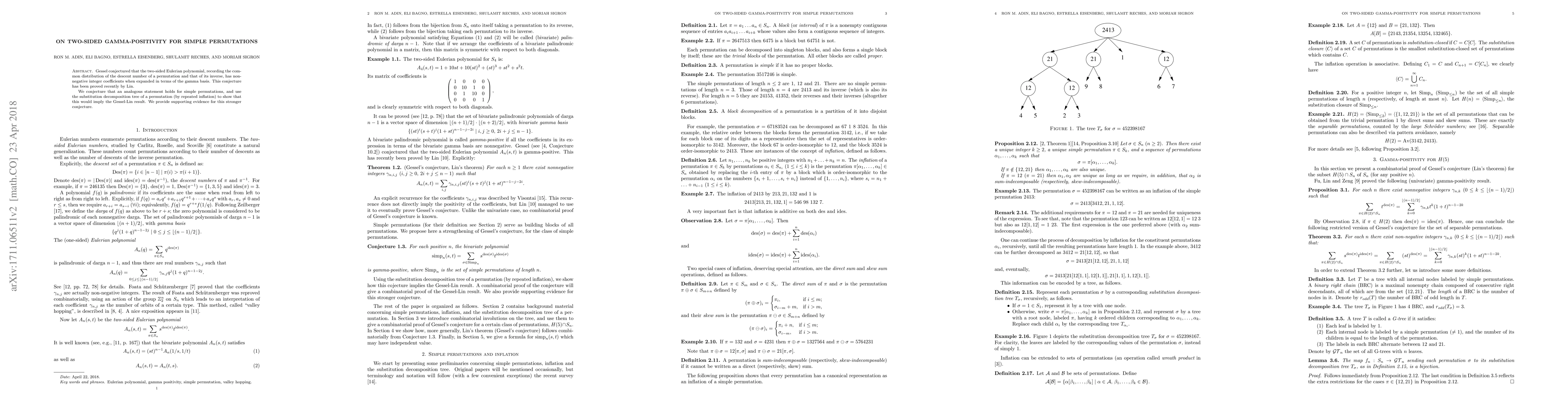 Gessel conjectured that the two-sided Eulerian polynomial, recording the common distribution of the descent number of a permutation and that of its inverse, has non-negative integer coefficients when expanded in terms of the gamma basis. This conjecture has been proved recently by Lin. We conjecture that an analogous statement holds for simple permutations, and use the substitution decomposition tree of a permutation (by repeated inflation) to show that this would imply the Gessel-Lin result. We provide supporting evidence for this stronger conjecture.