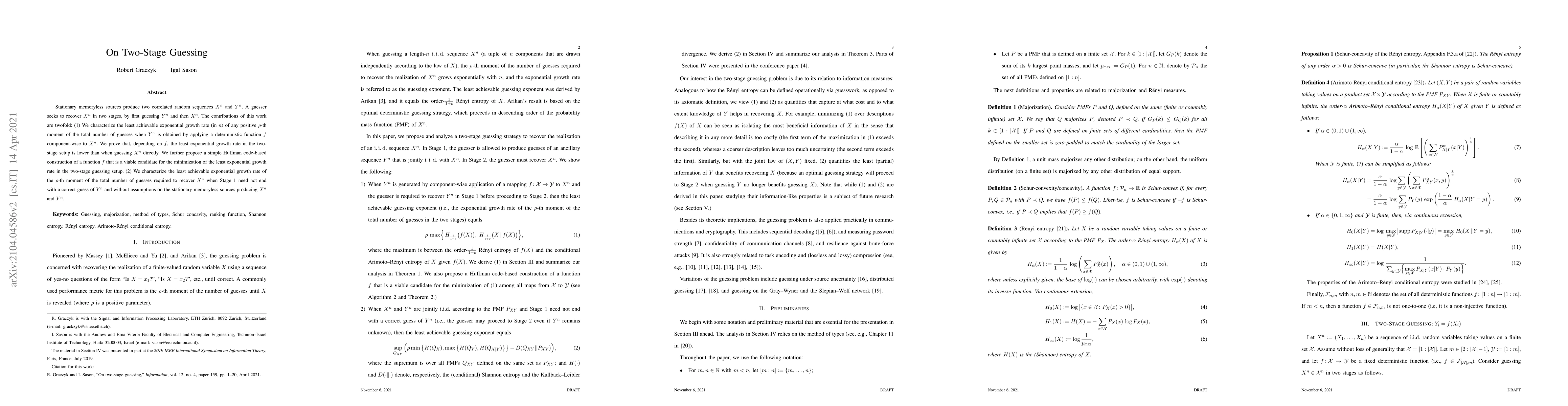 Stationary memoryless sources produce two correlated random sequences $X^n$ and $Y^n$. A guesser seeks to recover $X^n$ in two stages, by first guessing $Y^n$ and then $X^n$. The contributions of this work are twofold: (1) We characterize the least achievable exponential growth rate (in $n$) of any positive $\rho$-th moment of the total number of guesses when $Y^n$ is obtained by applying a deterministic function $f$ component-wise to $X^n$. We prove that, depending on $f$, the least exponential growth rate in the two-stage setup is lower than when guessing $X^n$ directly. We further propose a simple Huffman code-based construction of a function $f$ that is a viable candidate for the minimization of the least exponential growth rate in the two-stage guessing setup. (2) We characterize the least achievable exponential growth rate of the $\rho$-th moment of the total number of guesses required to recover $X^n$ when Stage 1 need not end with a correct guess of $Y^n$ and without assumptions on the stationary memoryless sources producing $X^n$ and $Y^n$.