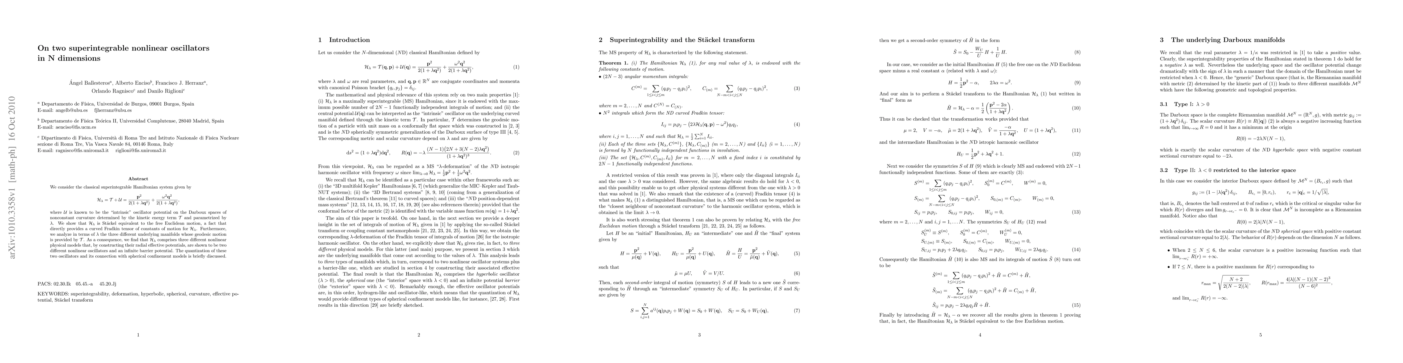 We consider the classical superintegrable Hamiltonian system given by $H=T+U={p^2}/{2(1+\lambda q^2)}+{{\omega}^2 q^2}/{2(1+\lambda q^2)}$, where U is known to be the "intrinsic" oscillator potential on the Darboux spaces of nonconstant curvature determined by the kinetic energy term T and parametrized by {\lambda}. We show that H is Stackel equivalent to the free Euclidean motion, a fact that directly provides a curved Fradkin tensor of constants of motion for H. Furthermore, we analyze in terms of {\lambda} the three different underlying manifolds whose geodesic motion is provided by T. As a consequence, we find that H comprises three different nonlinear physical models that, by constructing their radial effective potentials, are shown to be two different nonlinear oscillators and an infinite barrier potential. The quantization of these two oscillators and its connection with spherical confinement models is briefly discussed.