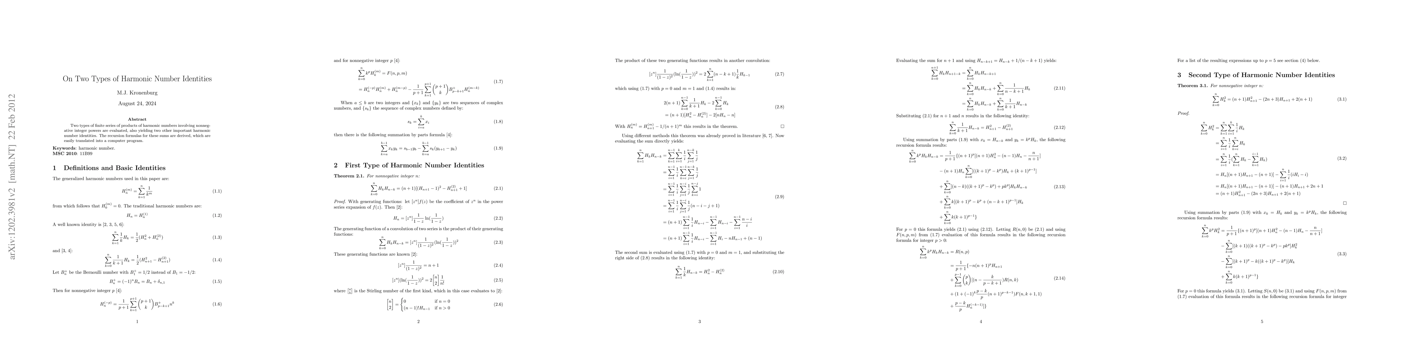 Two types of finite series of products of harmonic numbers involving nonnegative integer powers are evaluated, also yielding two other important harmonic number identities. The recursion formulas for these sums are derived, which are easily translated into a computer program.