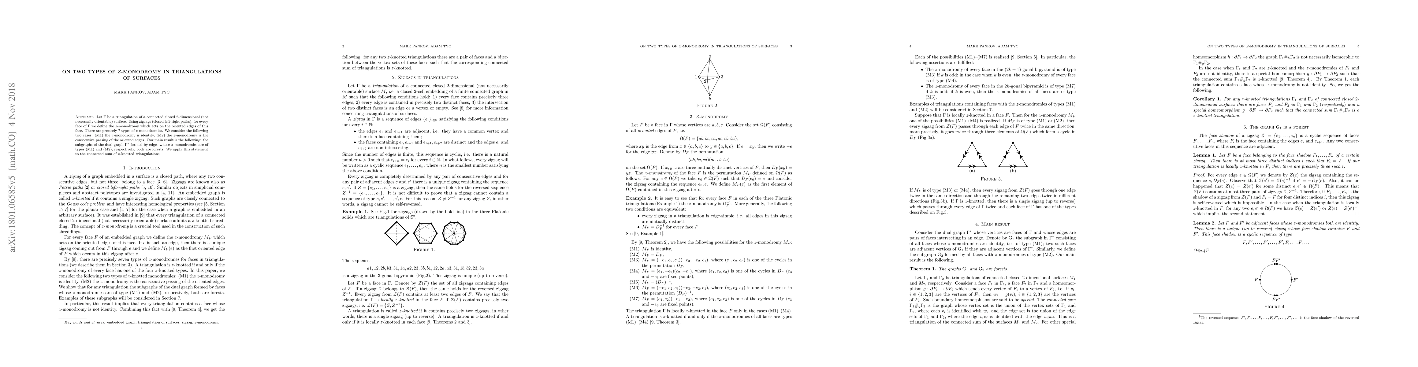 Let $\Gamma$ be a triangulation of a connected closed $2$-dimensional (not necessarily orientable) surface. Using zigzags (closed left-right paths), for every face of $\Gamma$ we define the $z$-monodromy which acts on the oriented edges of this face. There are precisely $7$ types of $z$-monodromies. We consider the following two cases: (M1) the $z$-monodromy is identity, (M2) the $z$-monodromy is the consecutive passing of the oriented edges. Our main result is the following: the subgraphs of the dual graph $\Gamma^{*}$ formed by edges whose $z$-monodromies are of types (M1) and (M2), respectively, both are forests. We apply this statement to the connected sum of $z$-knotted triangulations.