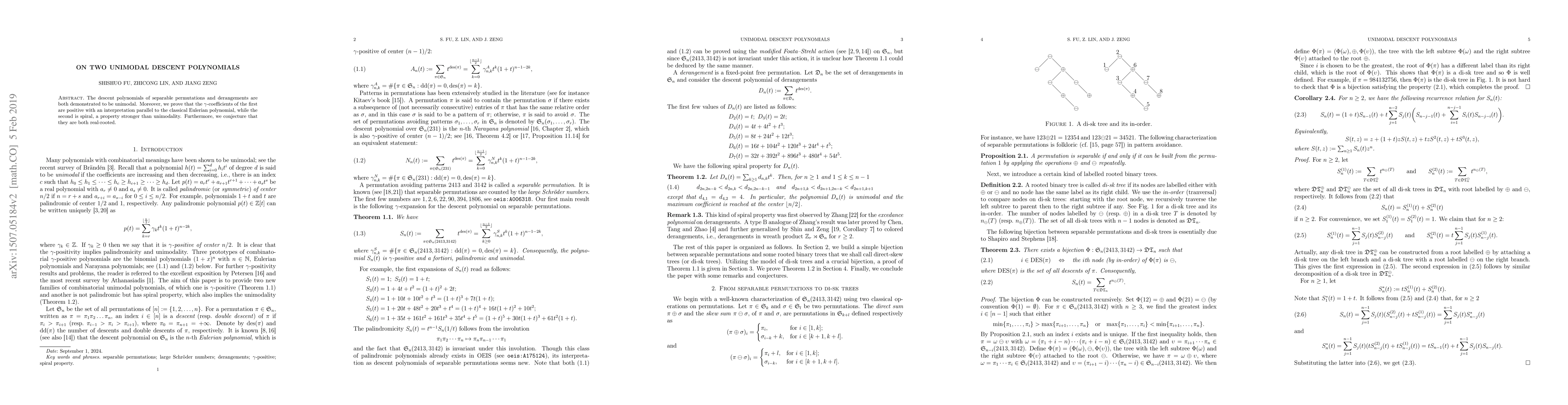 The paper demonstrates that descent polynomials for both separable permutations and derangements are unimodal, with the former having positive $\gamma$-coefficients akin to classical Eulerian polynomials, and the latter exhibiting a stronger spiral property. The authors also conjecture that both polynomials are real-rooted.