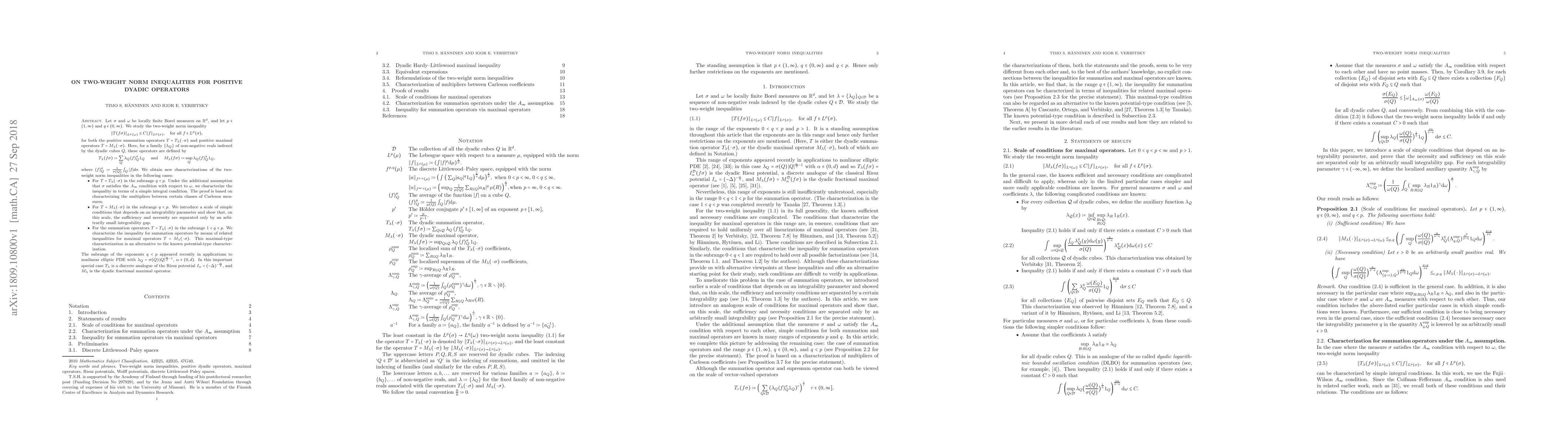 Let $\sigma$ and $\omega$ be locally finite Borel measures on $\mathbb{R}^d$, and let $p\in(1,\infty)$ and $q\in(0,\infty)$. We study the two-weight norm inequality $$ \lVert T(f\sigma) \rVert_{L^q(\omega)}\leq C \lVert f \rVert_{L^p(\sigma)}, \quad \text{for all} \, \, f \in L^p(\sigma), $$ for both the positive summation operators $T=T_\lambda(\cdot \sigma)$ and positive maximal operators $T=M_\lambda(\cdot \sigma)$. Here, for a family $\{\lambda_Q\}$ of non-negative reals indexed by the dyadic cubes $Q$, these operators are defined by $$ T_\lambda(f\sigma):=\sum_Q \lambda_Q \langle f\rangle^\sigma_Q 1_Q \quad\text{ and } \quad M_\lambda(f\sigma):=\sup_Q \lambda_Q \langle f\rangle^\sigma_Q 1_Q, $$ where $\langle f\rangle^\sigma_Q:=\frac{1}{\sigma(Q)} \int_Q |f| d \sigma.$ We obtain new characterizations of the two-weight norm inequalities in the following cases: 1. For $T=T_\lambda(\cdot\sigma)$ in the subrange $q