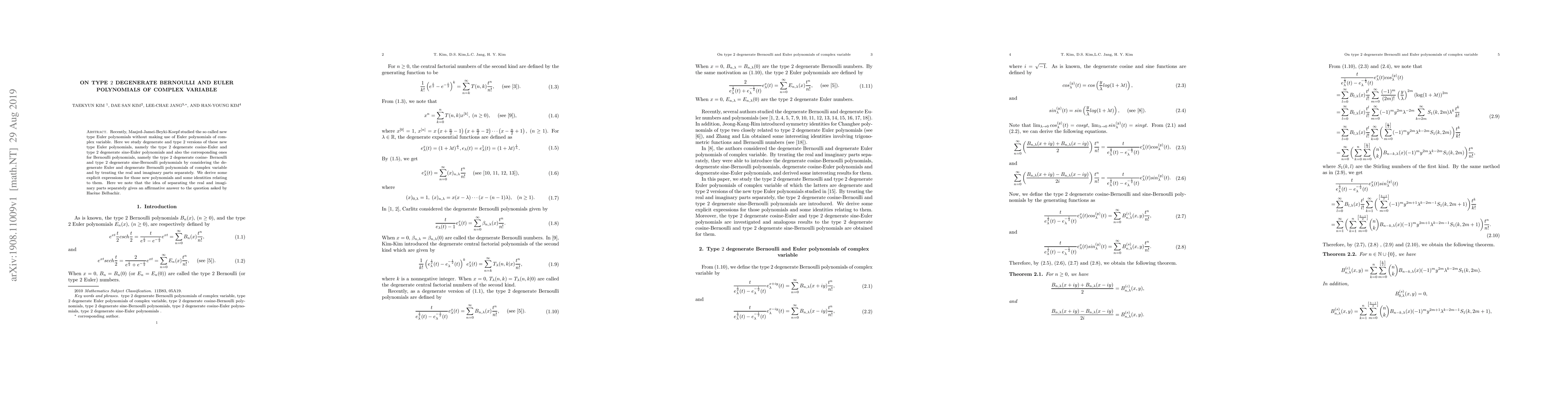 Recently, Masjed-Jamei-Beyki-Koepf studied the so called new type Euler polynomials without making use of Euler polynomials of complex variable. Here we study degenerate and type 2 versions of these new type Euler polynomials, namely the type 2 degenerate cosine-Euler and type 2 degenerate sine-Euler polynomials and also the corresponding ones for Bernoulli polynomials, namely the type 2 degenerate cosine-Bernoulli and type 2 degenerate sine-Bernoulli polynomials by considering the degenerate Euler and degenerate Bernoulli polynomials of complex variable and by treating the real and imaginary parts separately. We derive some explicit expressions for those new polynomials and some identities relating to them. Here we note that the idea of separating the real and imaginary parts separately gives an affirmative answer to the question asked by Belbachir.