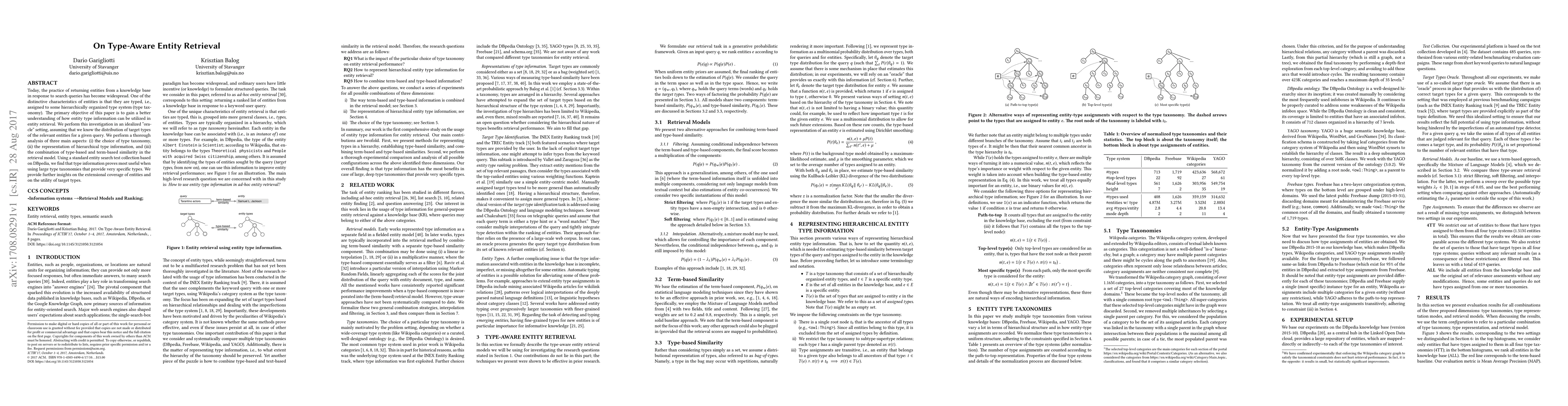 This paper investigates how type information from a knowledge base can enhance entity retrieval, focusing on type taxonomy choice, hierarchical type representation, and the integration of type-based and term-based similarity. Findings suggest that large, specific type taxonomies yield the most effective retrieval results.