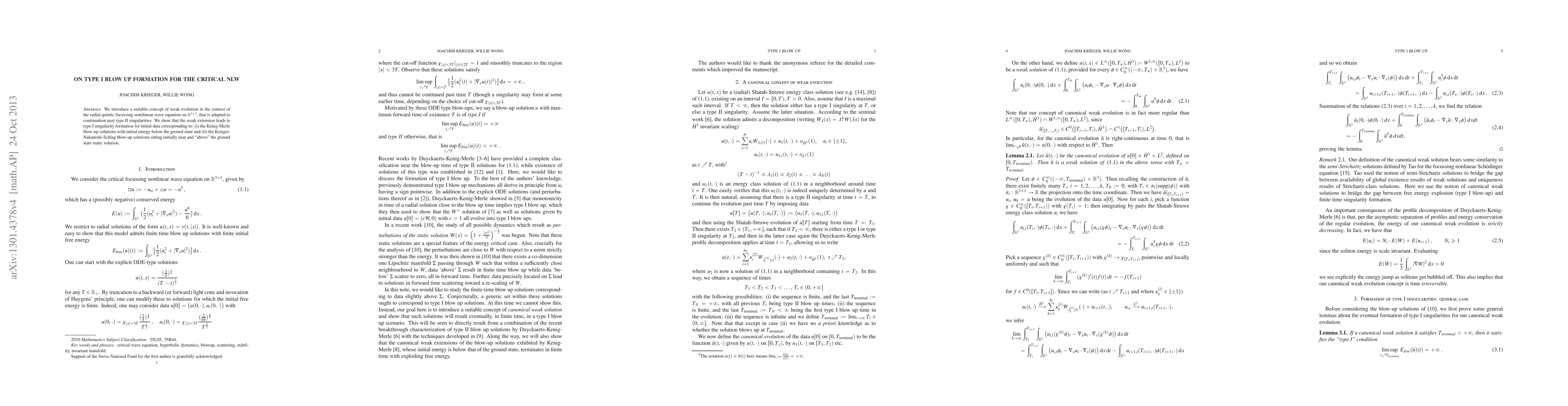 We introduce a suitable concept of weak evolution in the context of the radial quintic focussing semilinear wave equation on $\mathbb{R}^{3+1}$, that is adapted to continuation past type II singularities. We show that the weak extension leads to type I singularity formation for initial data corresponding to: (i) the Kenig-Merle blow-up solutions with initial energy below the ground state and (ii) the Krieger-Nakanishi-Schlag blow-up solutions sitting initially near and "above" the ground state static solution.